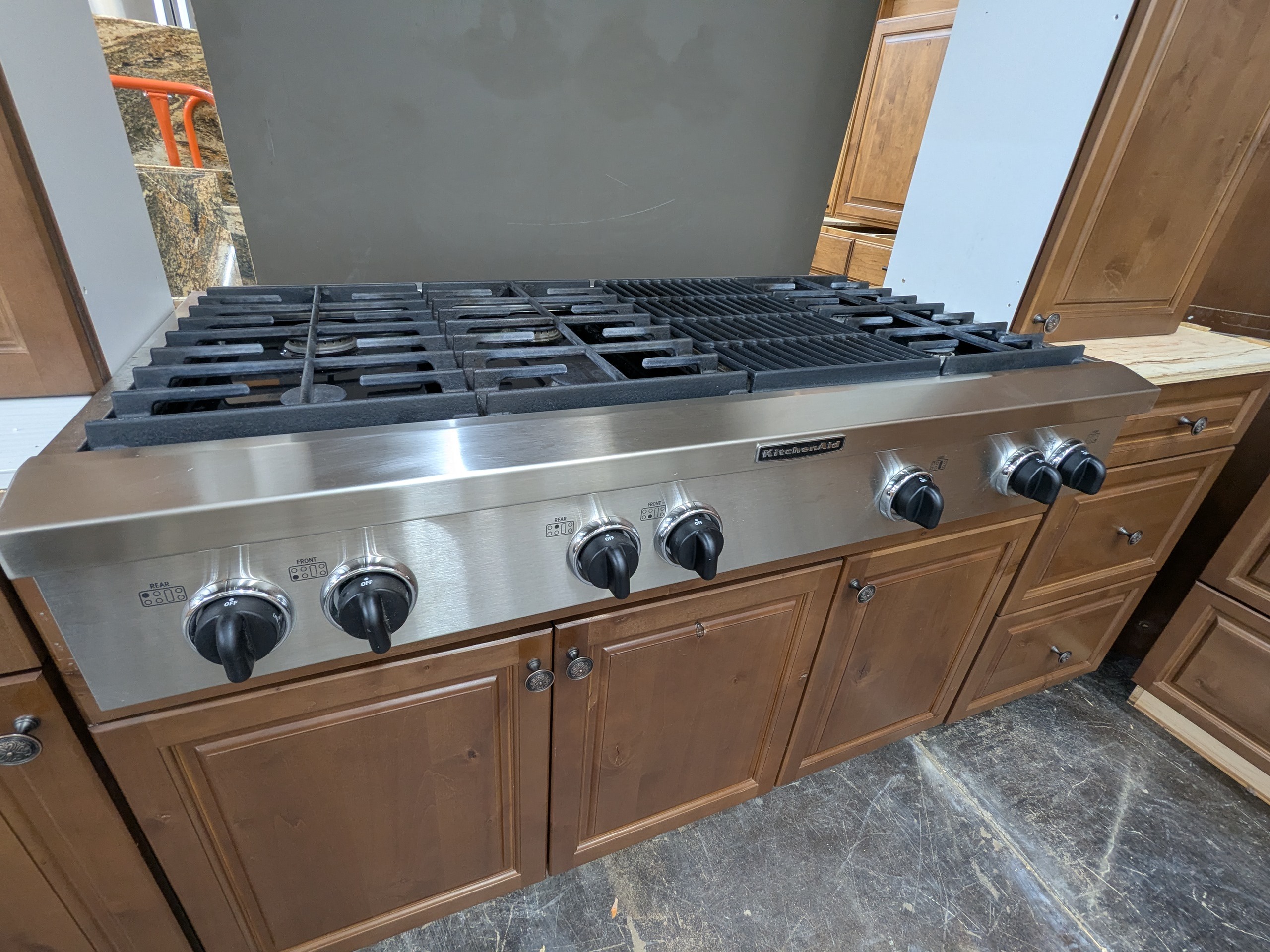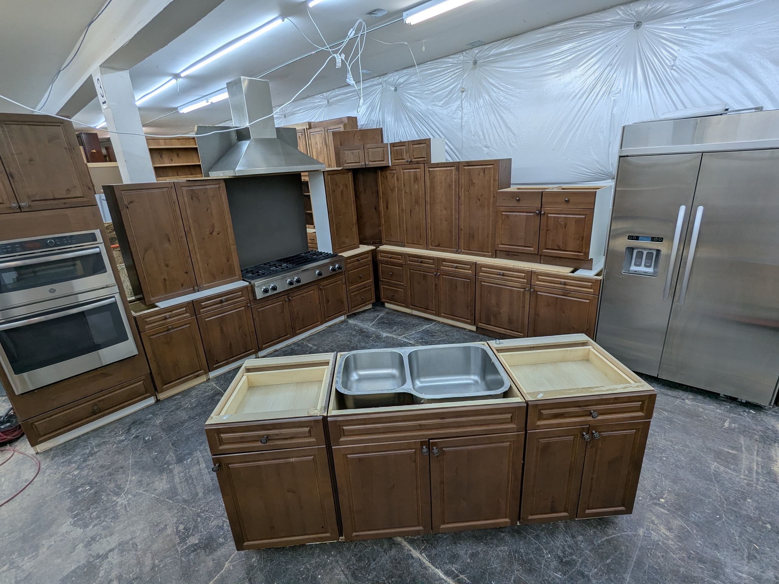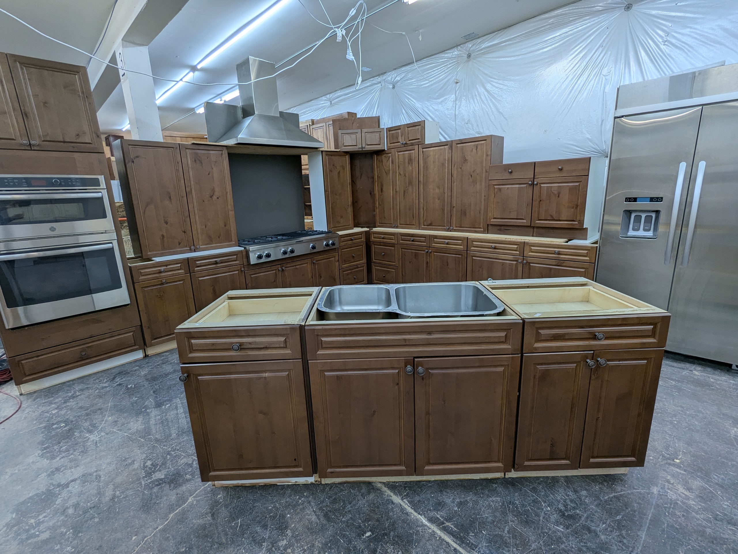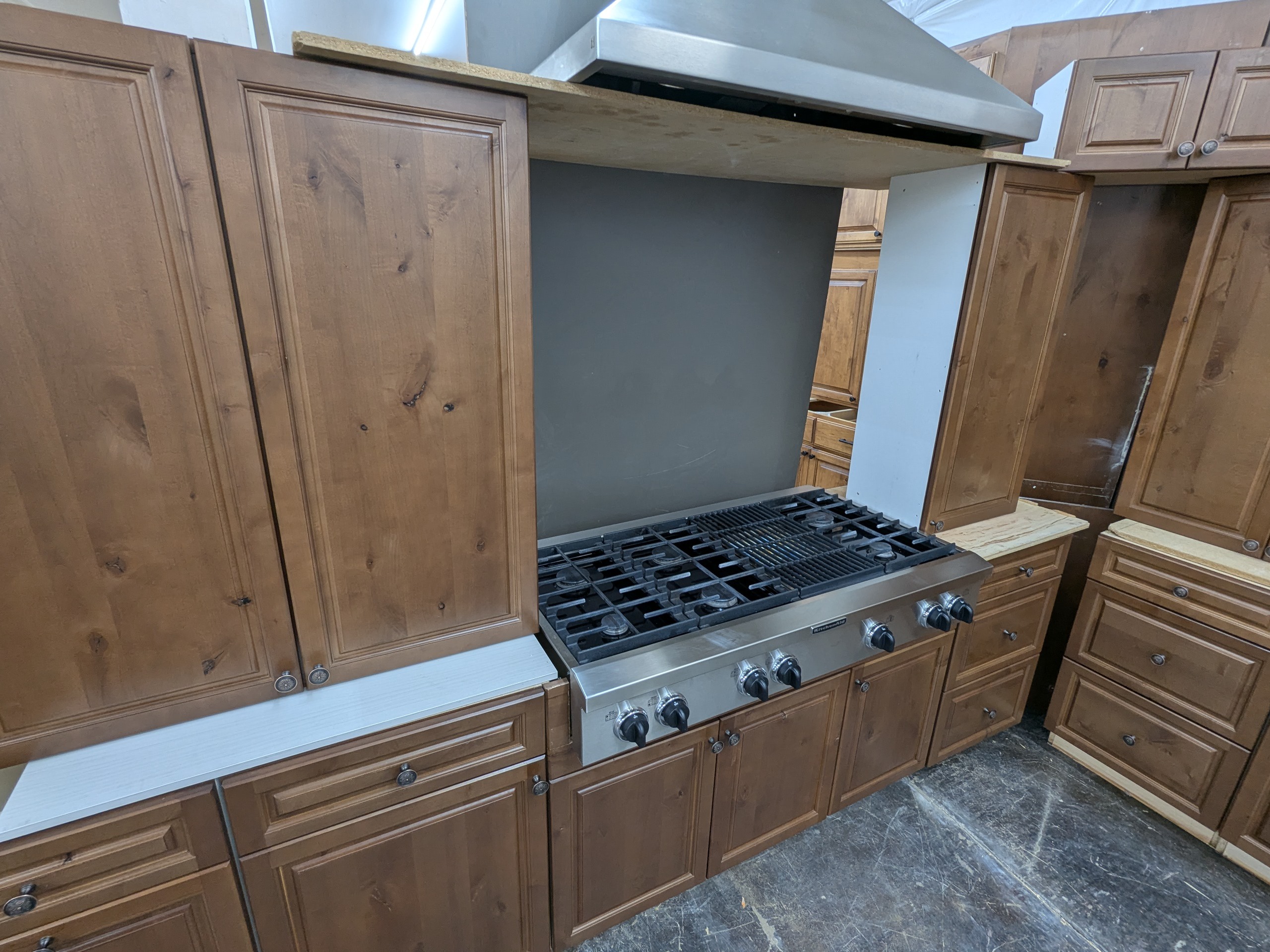 KitchenCraft frameless rustic used kitchen cabinets and appliances in great shape. These cabinets have dovetail and soft close drawers, and the appliances include large counter depth KitchenAid refrigerator, stainless wall oven/micro combo, huge professional KitchenAid gas cooktop, and Viking vent hood.