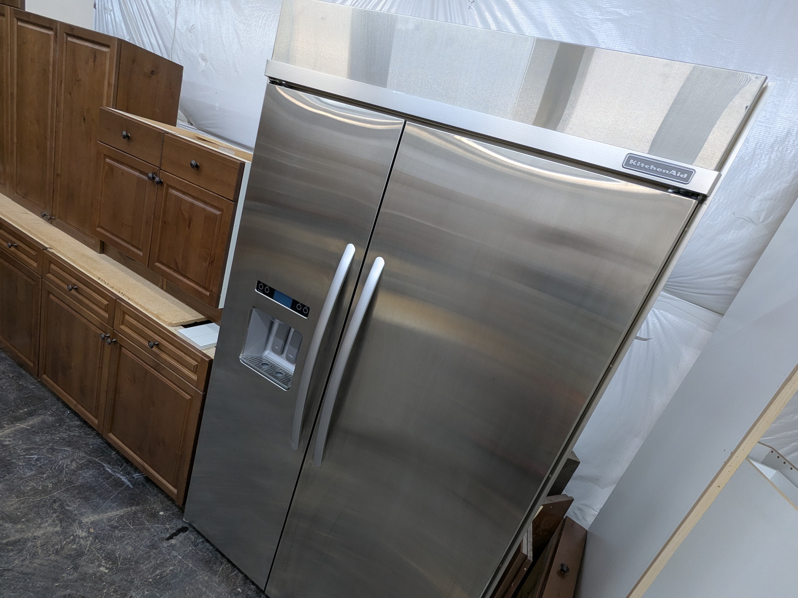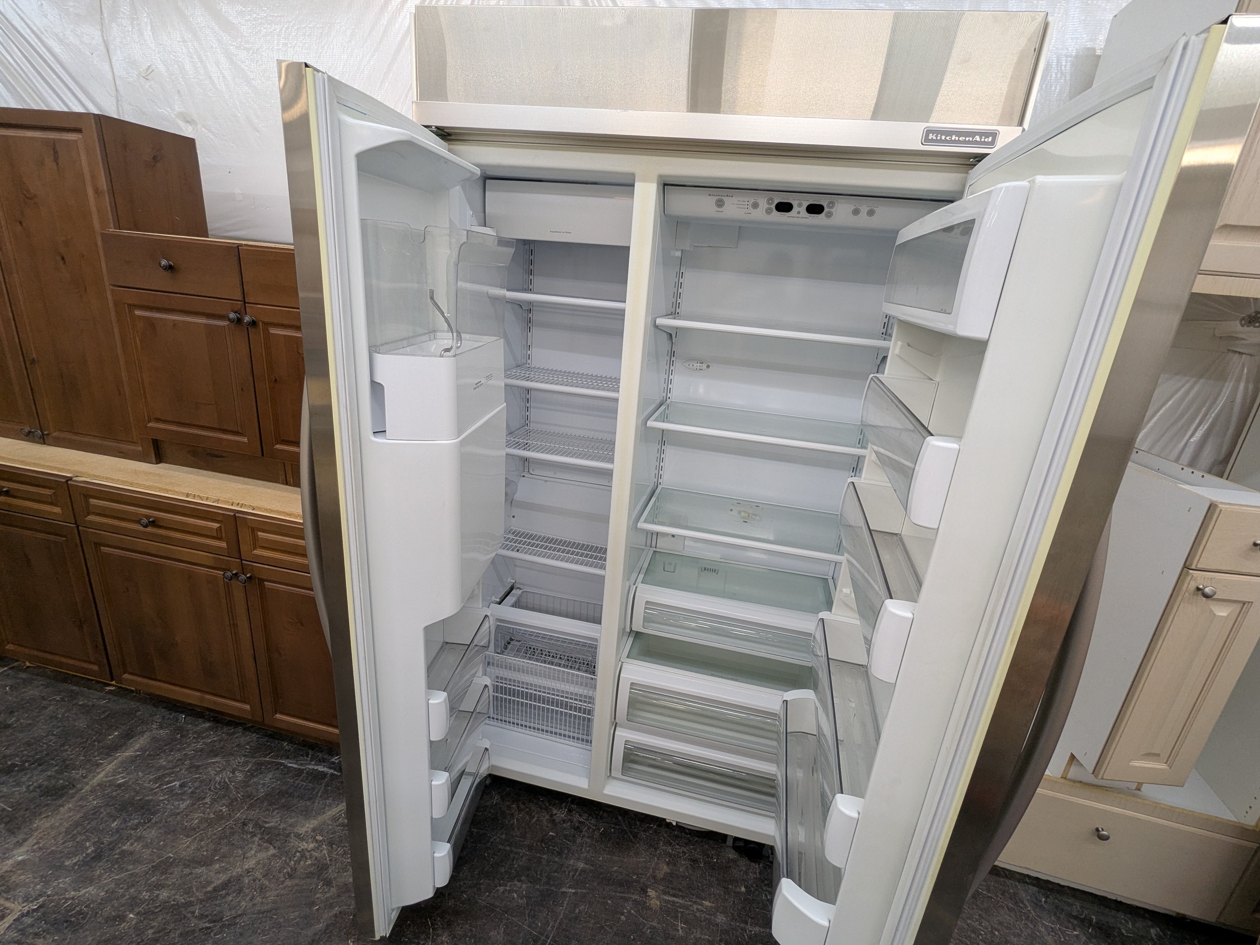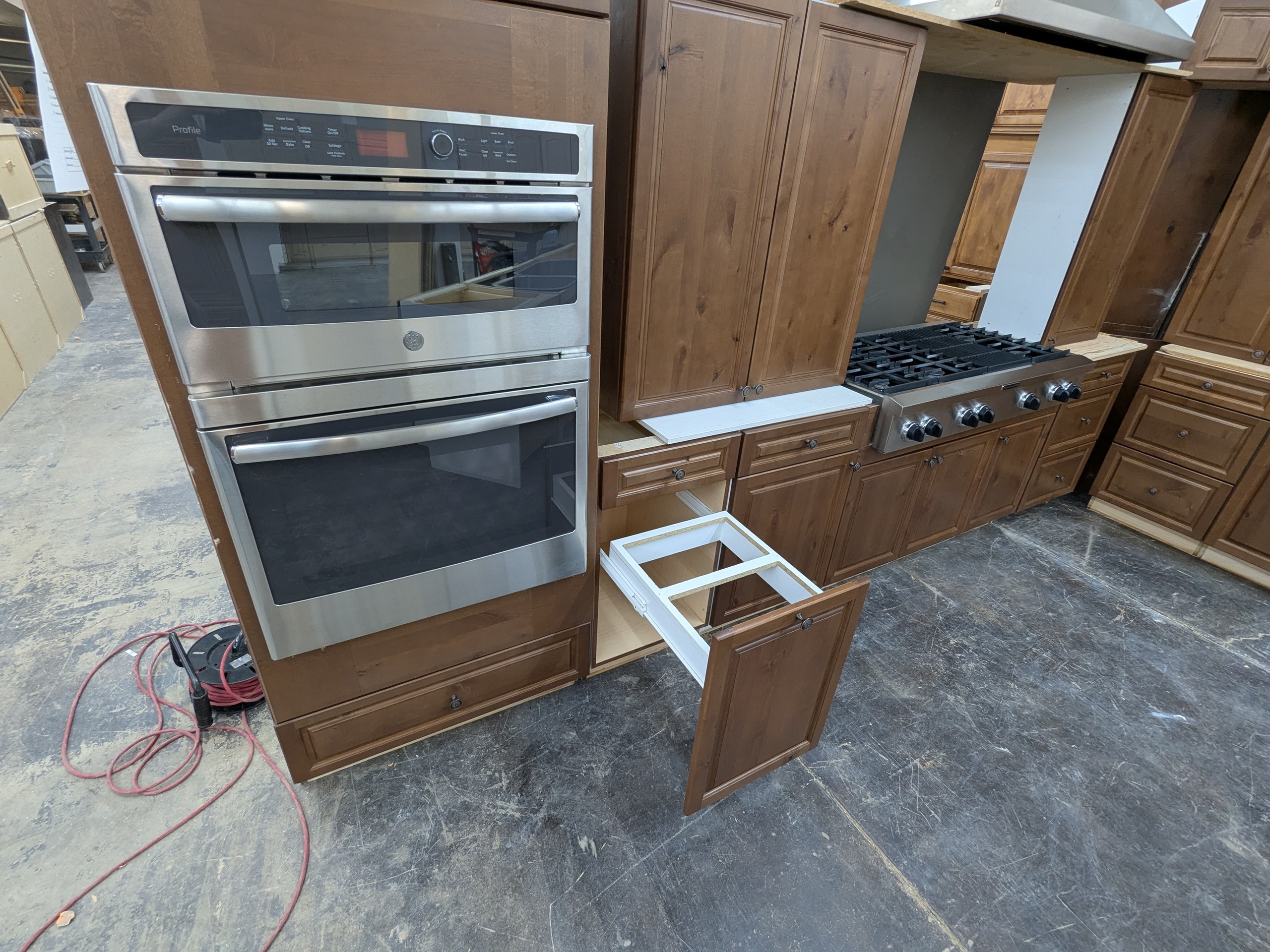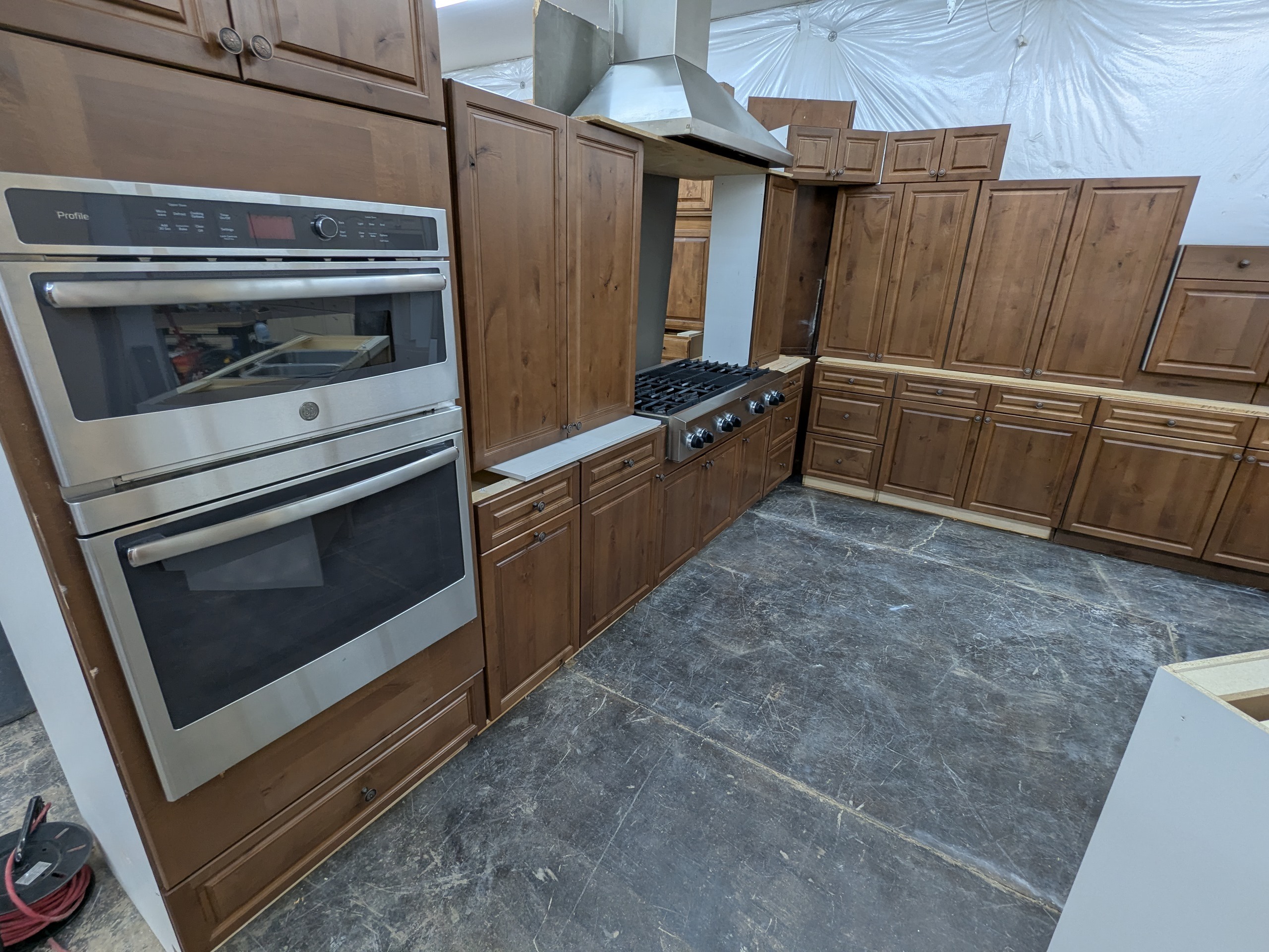 KitchenCraft frameless rustic used kitchen cabinets and appliances in great shape. These cabinets have dovetail and soft close drawers, and the appliances include large counter depth KitchenAid refrigerator, stainless wall oven/micro combo, huge professional KitchenAid gas cooktop, and Viking vent hood.