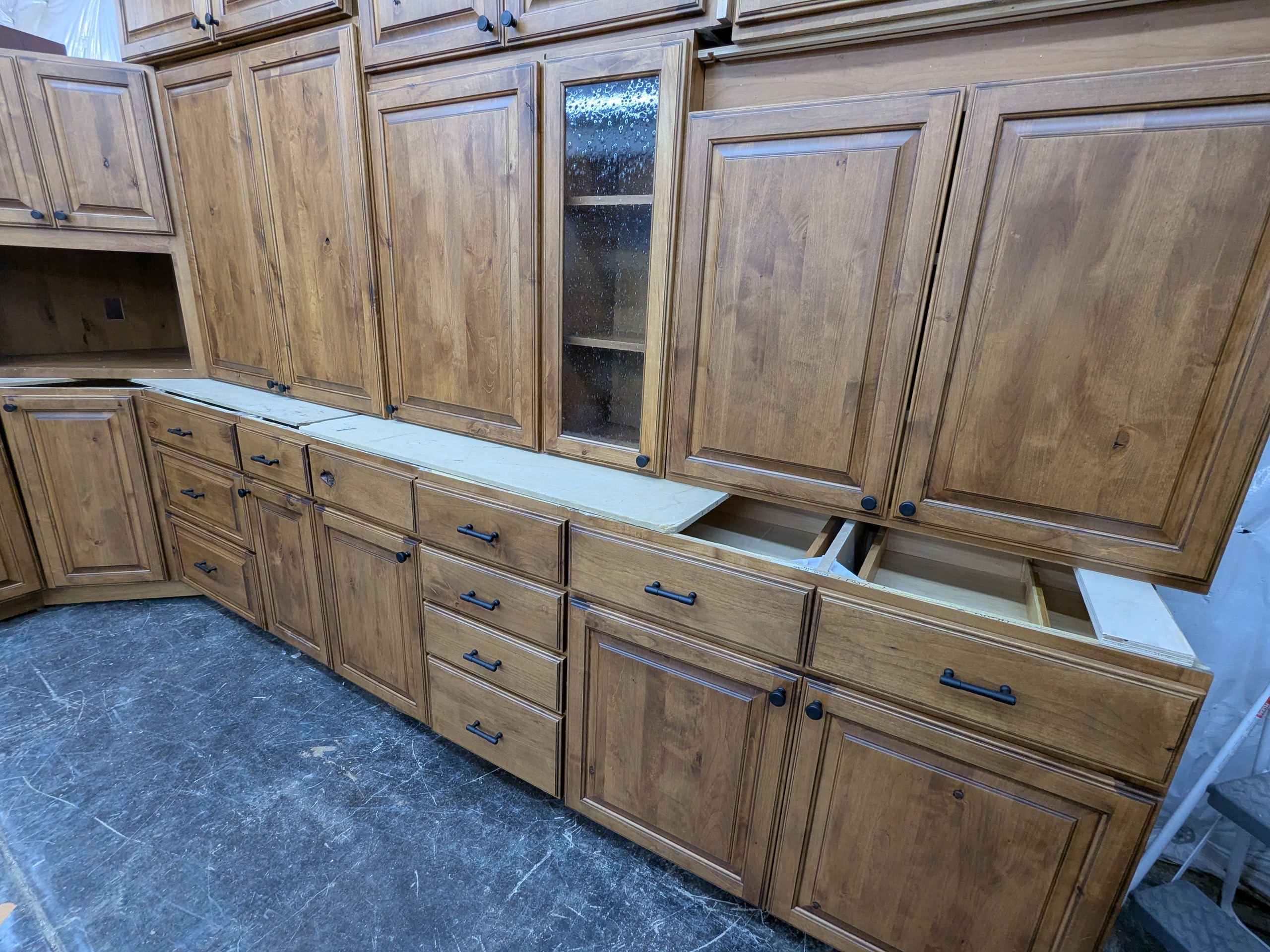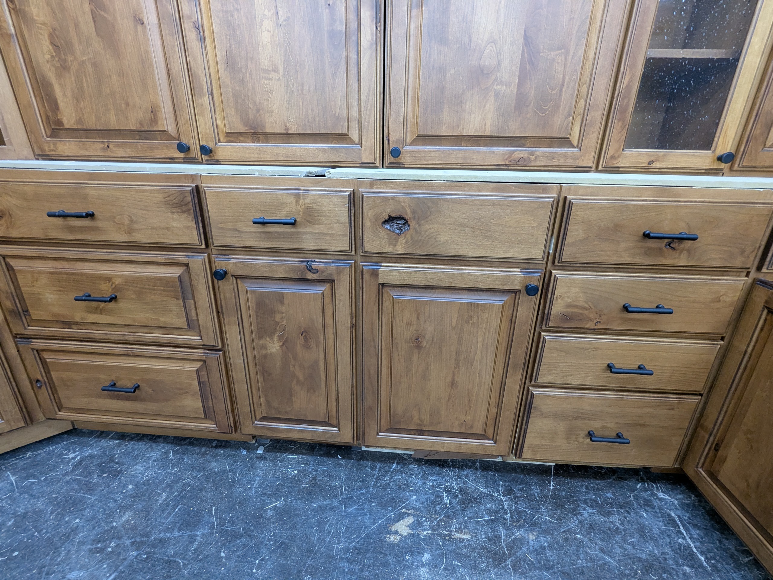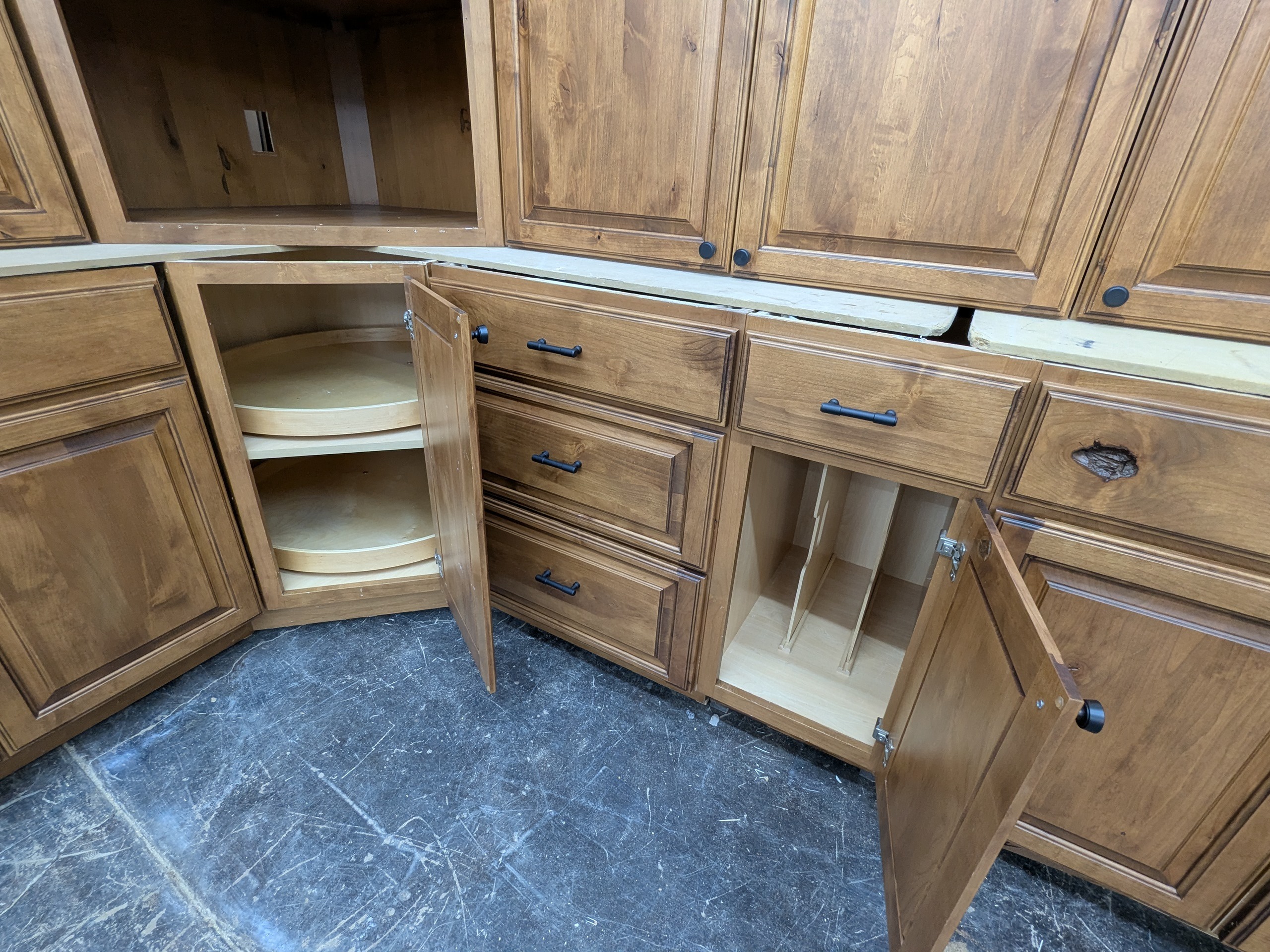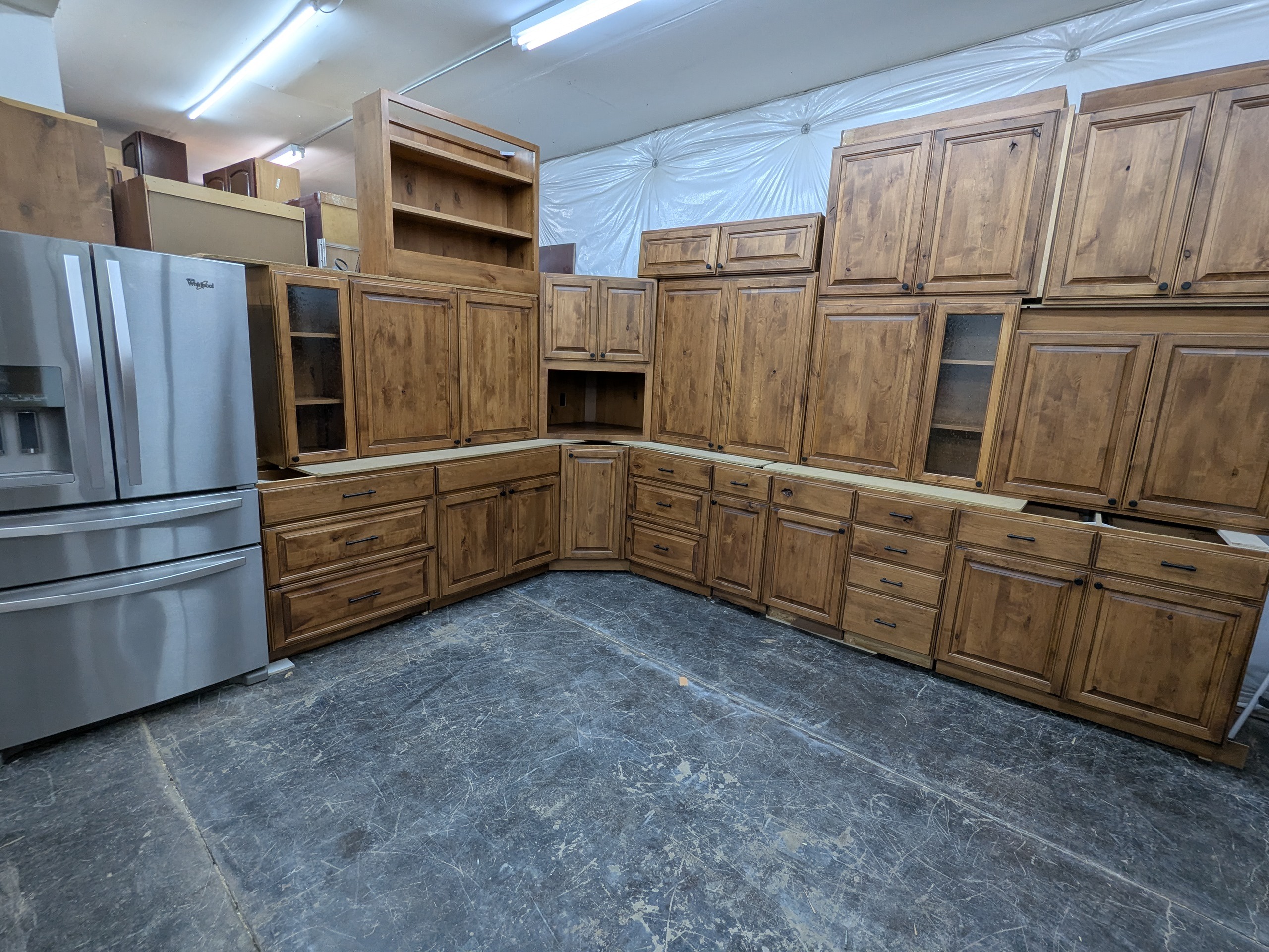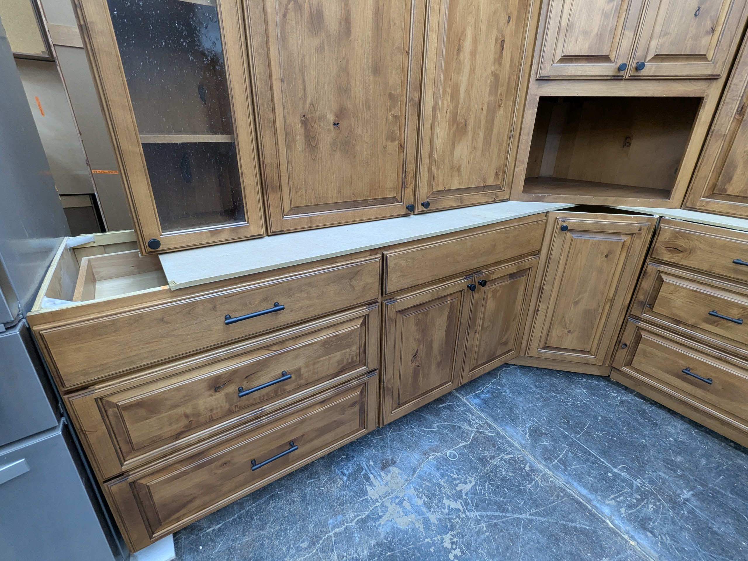 Beautiful rustic knotty alder used kitchen cabinets with dovetail drawers and plywood boxes, rollout trays, three drawer bases, tray dividers, seeded glass uppers, and super susan. These cabinets are in VERY good condition, and the package also includes a stainless French door refrigerator and quite a bit of gorgeous slab granite countertops.