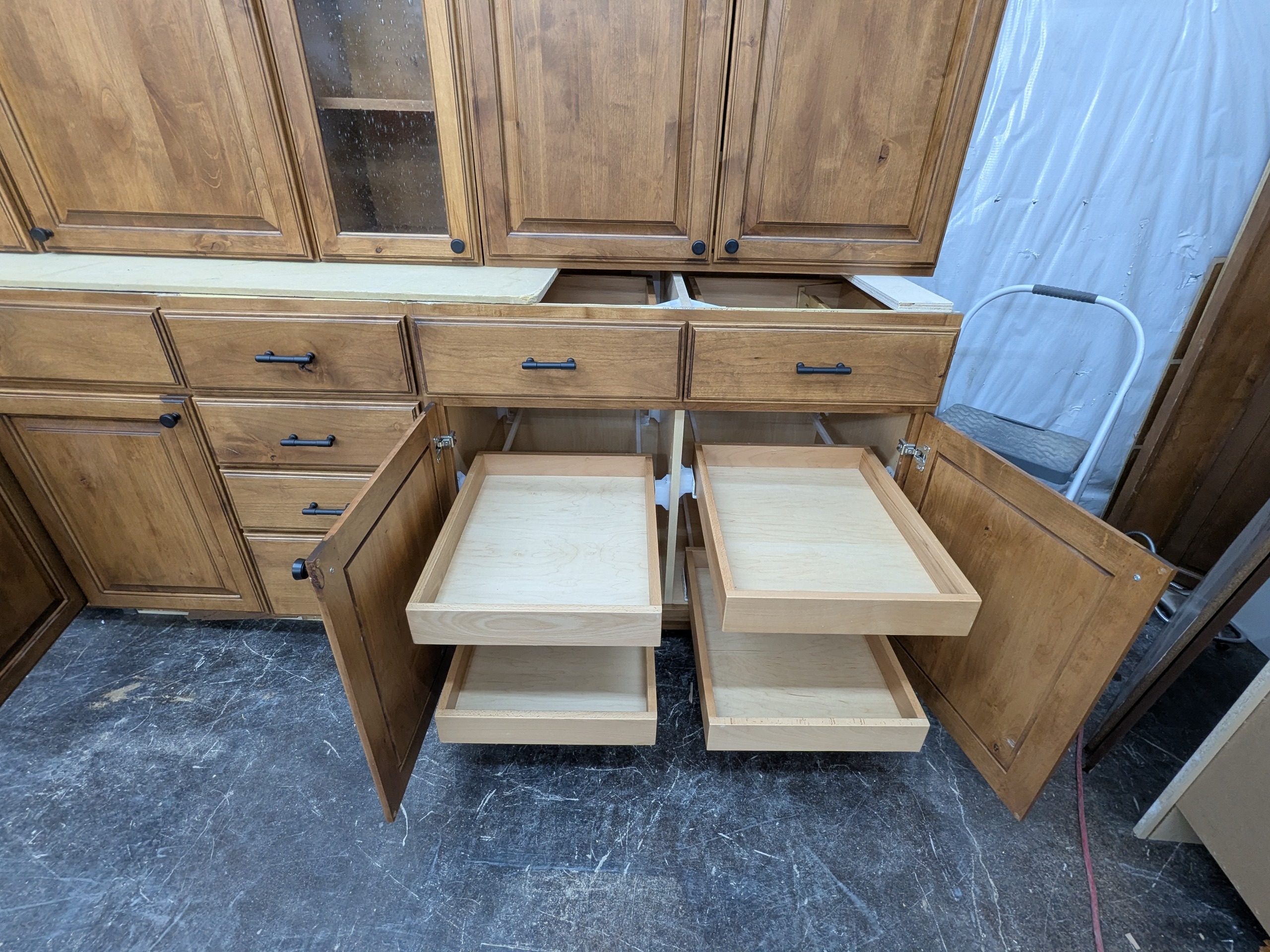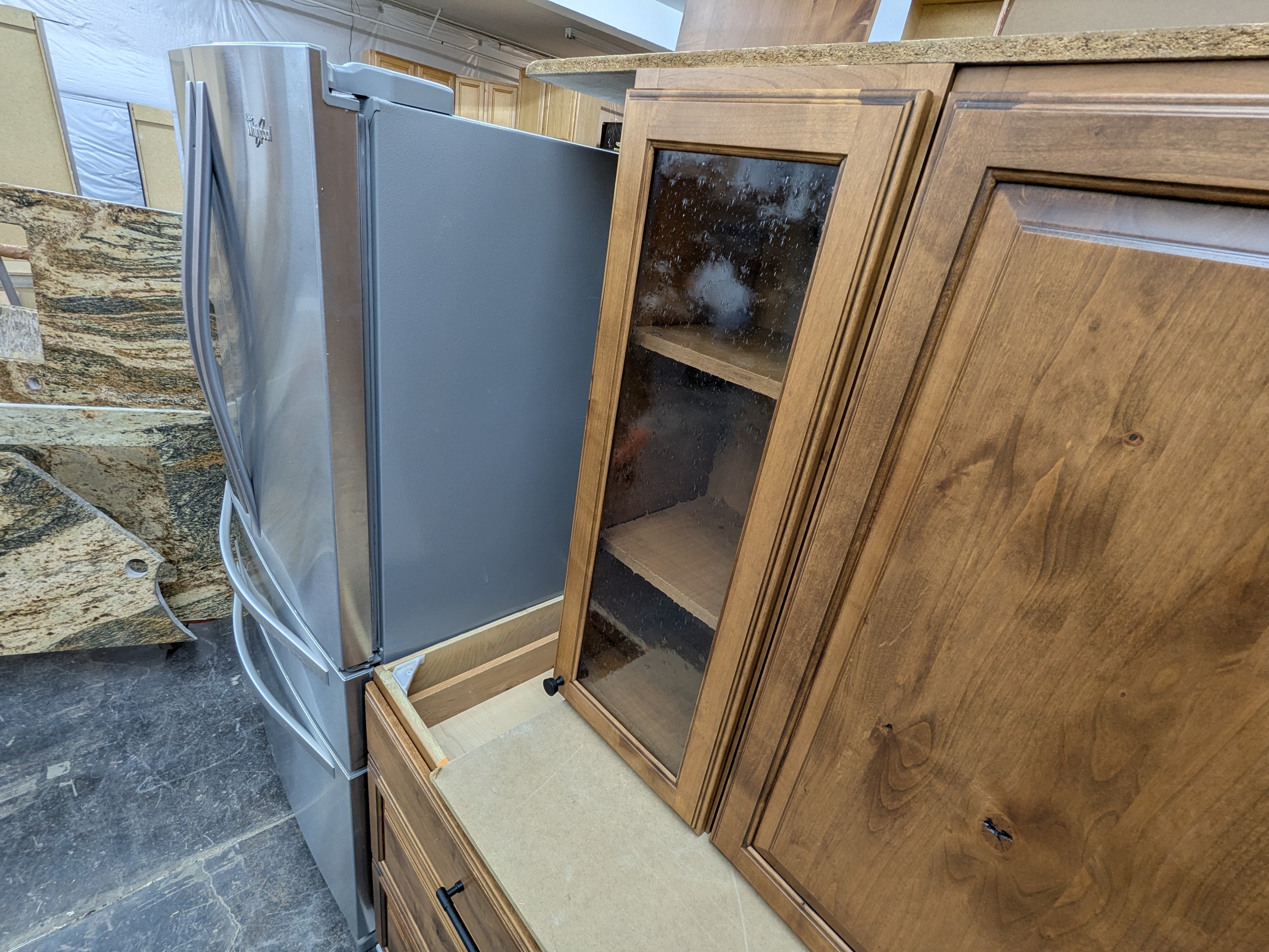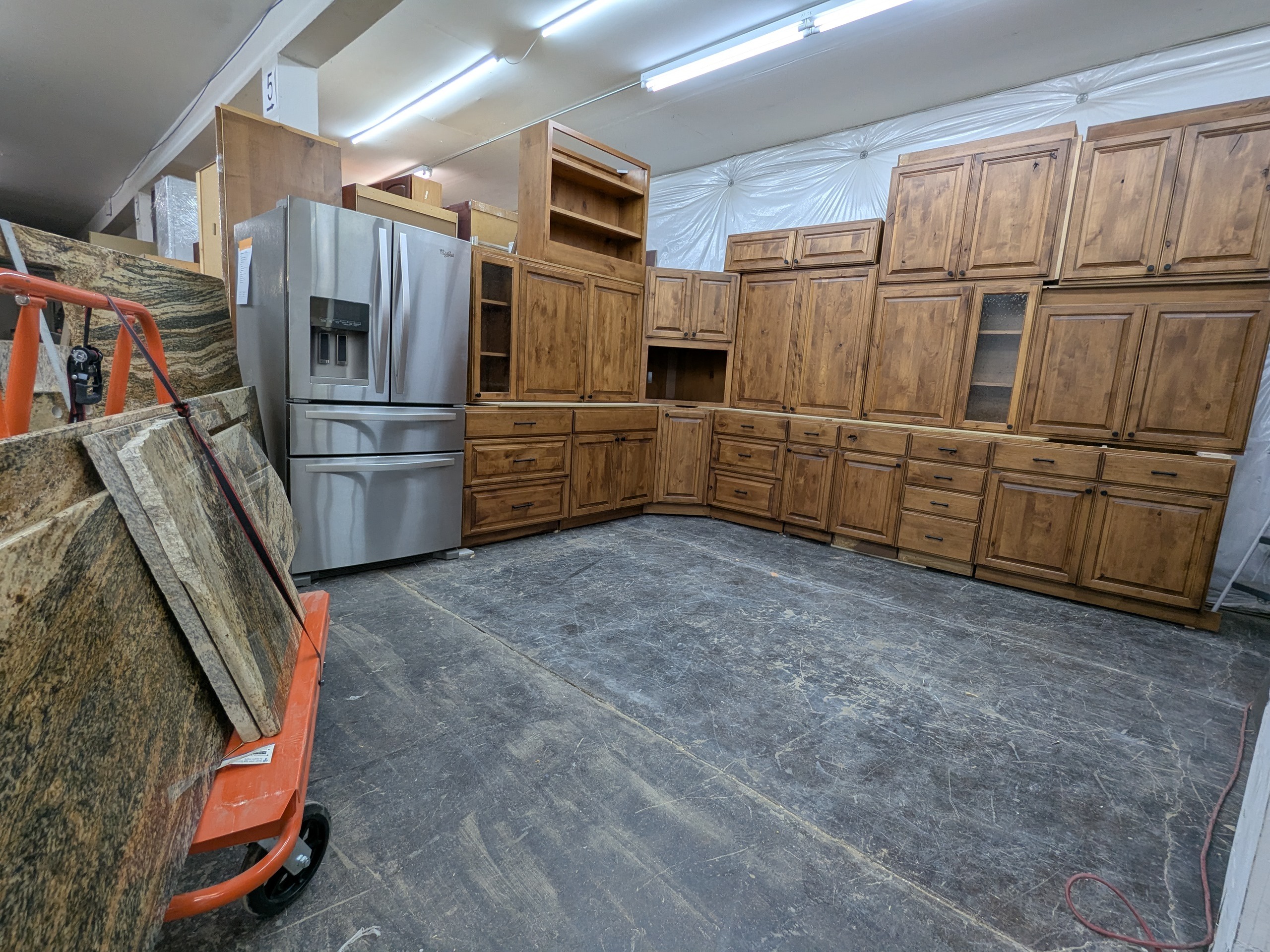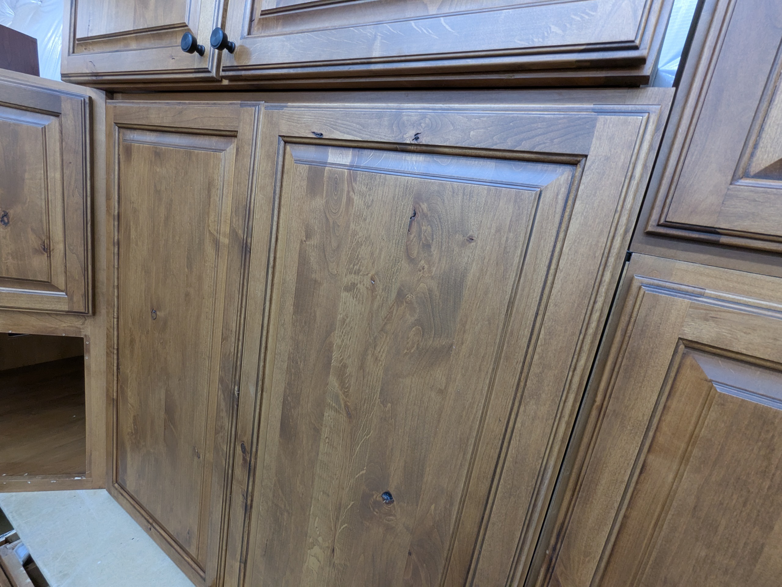 Beautiful rustic knotty alder used kitchen cabinets with dovetail drawers and plywood boxes, rollout trays, three drawer bases, tray dividers, seeded glass uppers, and super susan. These cabinets are in VERY good condition, and the package also includes a stainless French door refrigerator and quite a bit of gorgeous slab granite countertops.