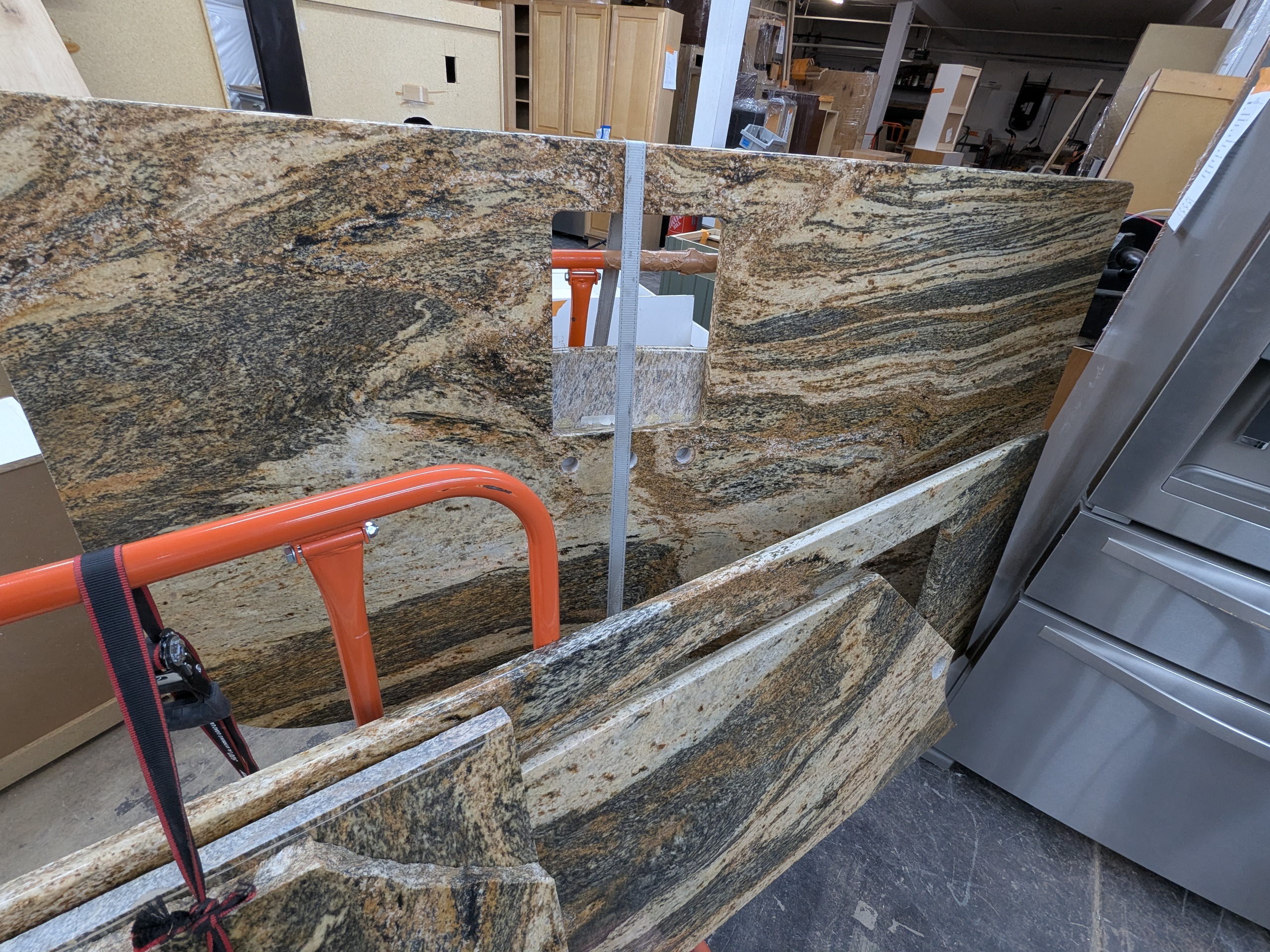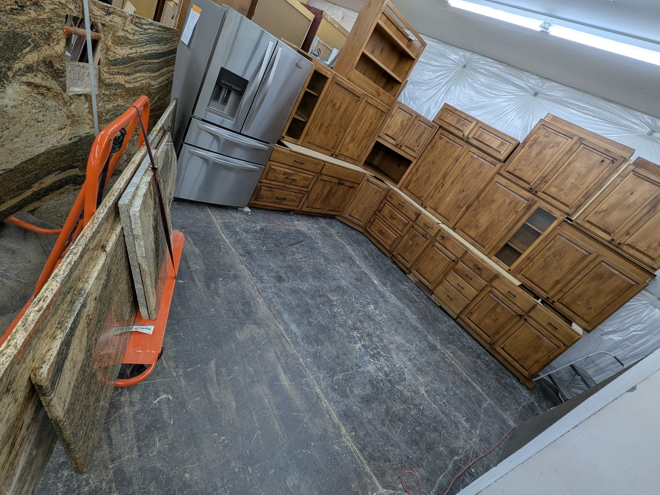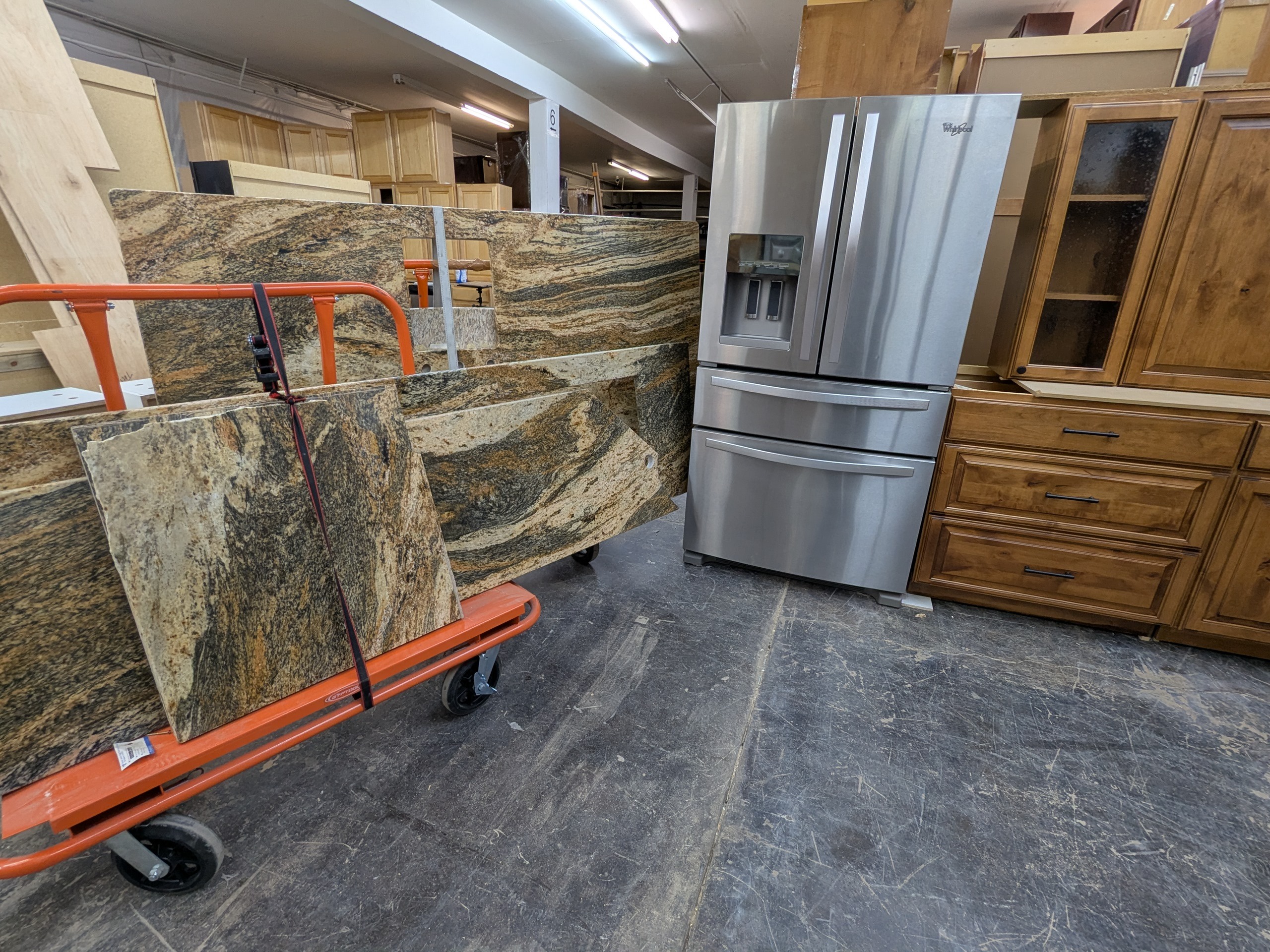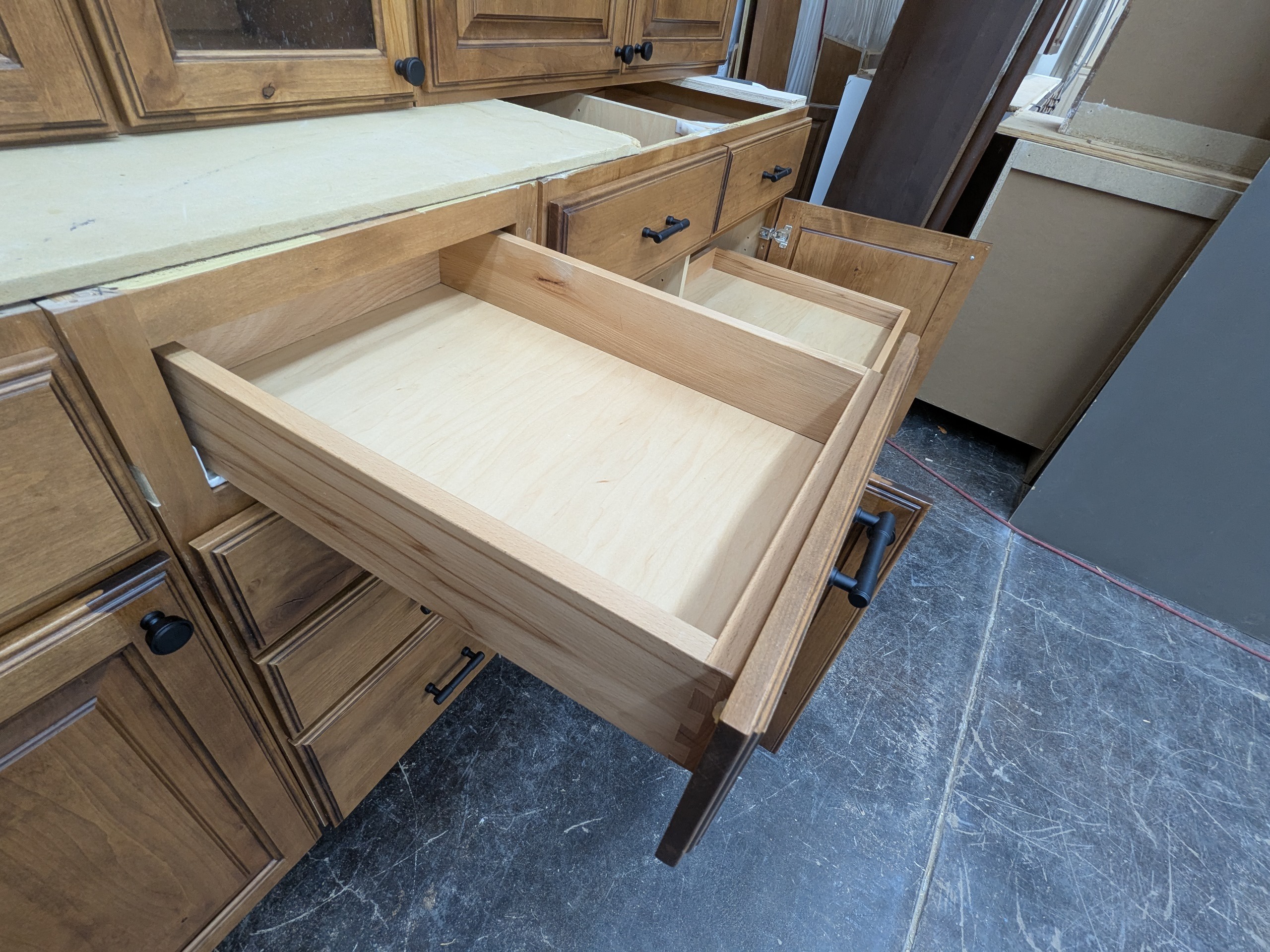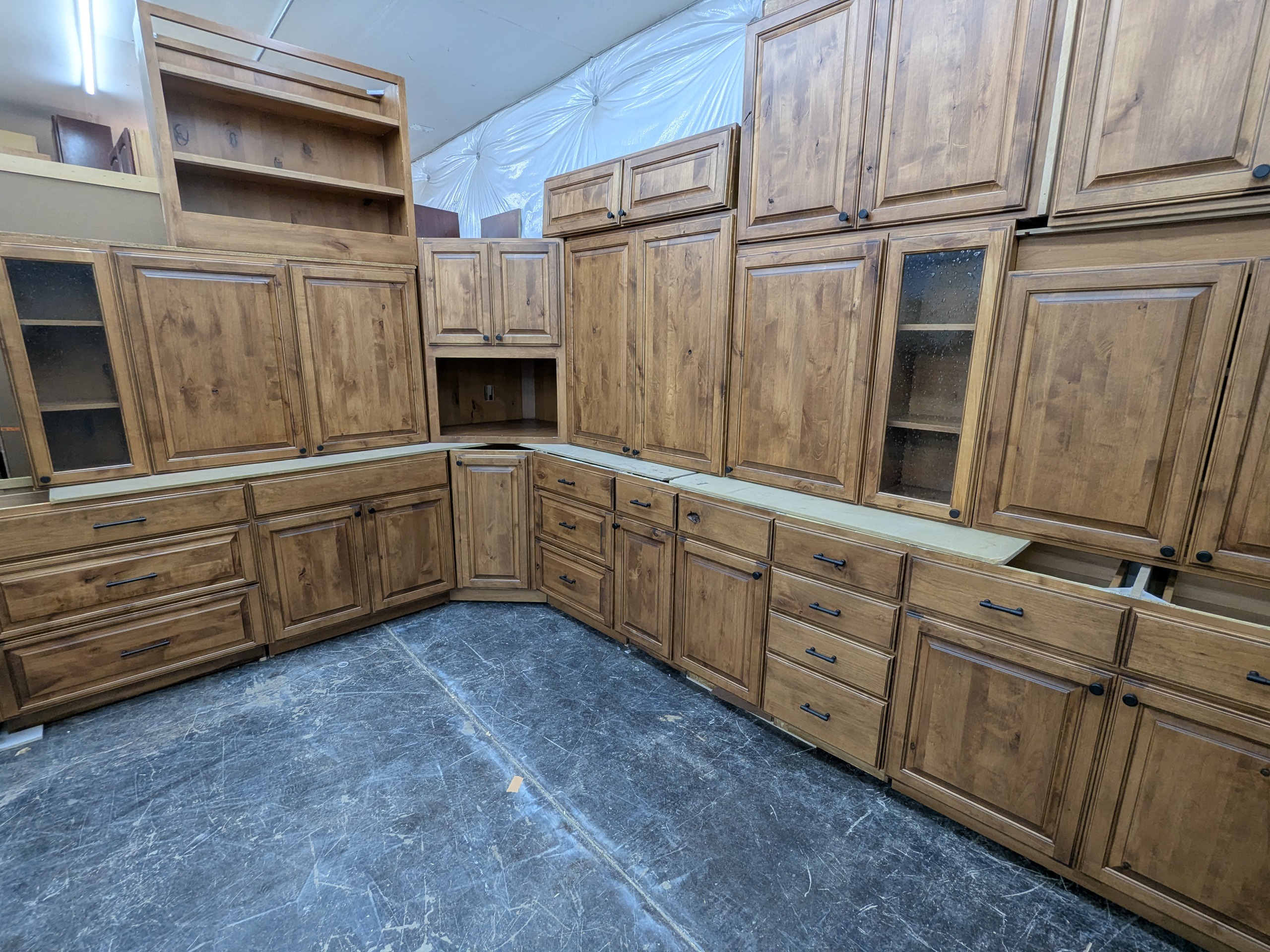 Beautiful rustic knotty alder used kitchen cabinets with dovetail drawers and plywood boxes, rollout trays, three drawer bases, tray dividers, seeded glass uppers, and super susan. These cabinets are in VERY good condition, and the package also includes a stainless French door refrigerator and quite a bit of gorgeous slab granite countertops.