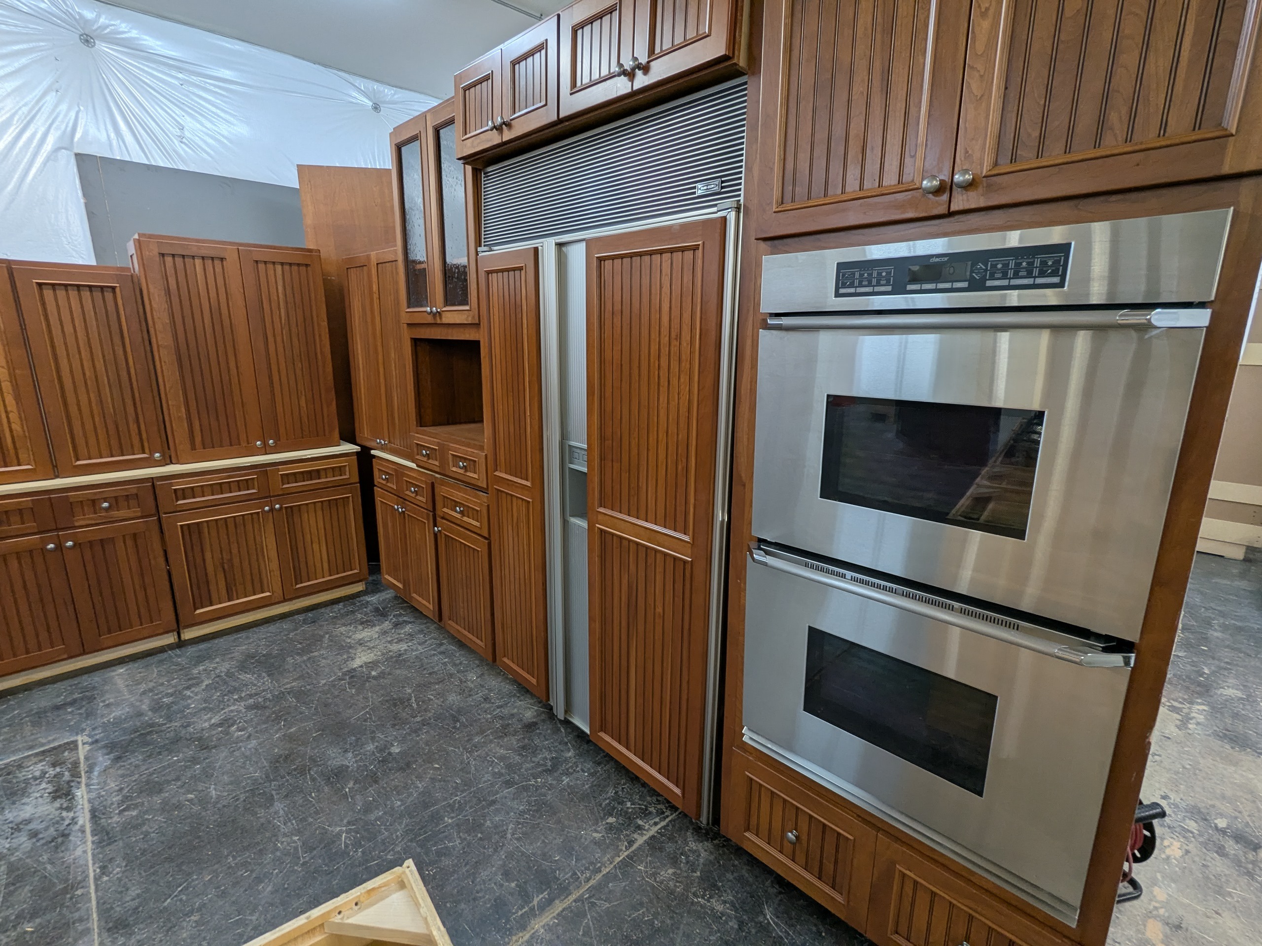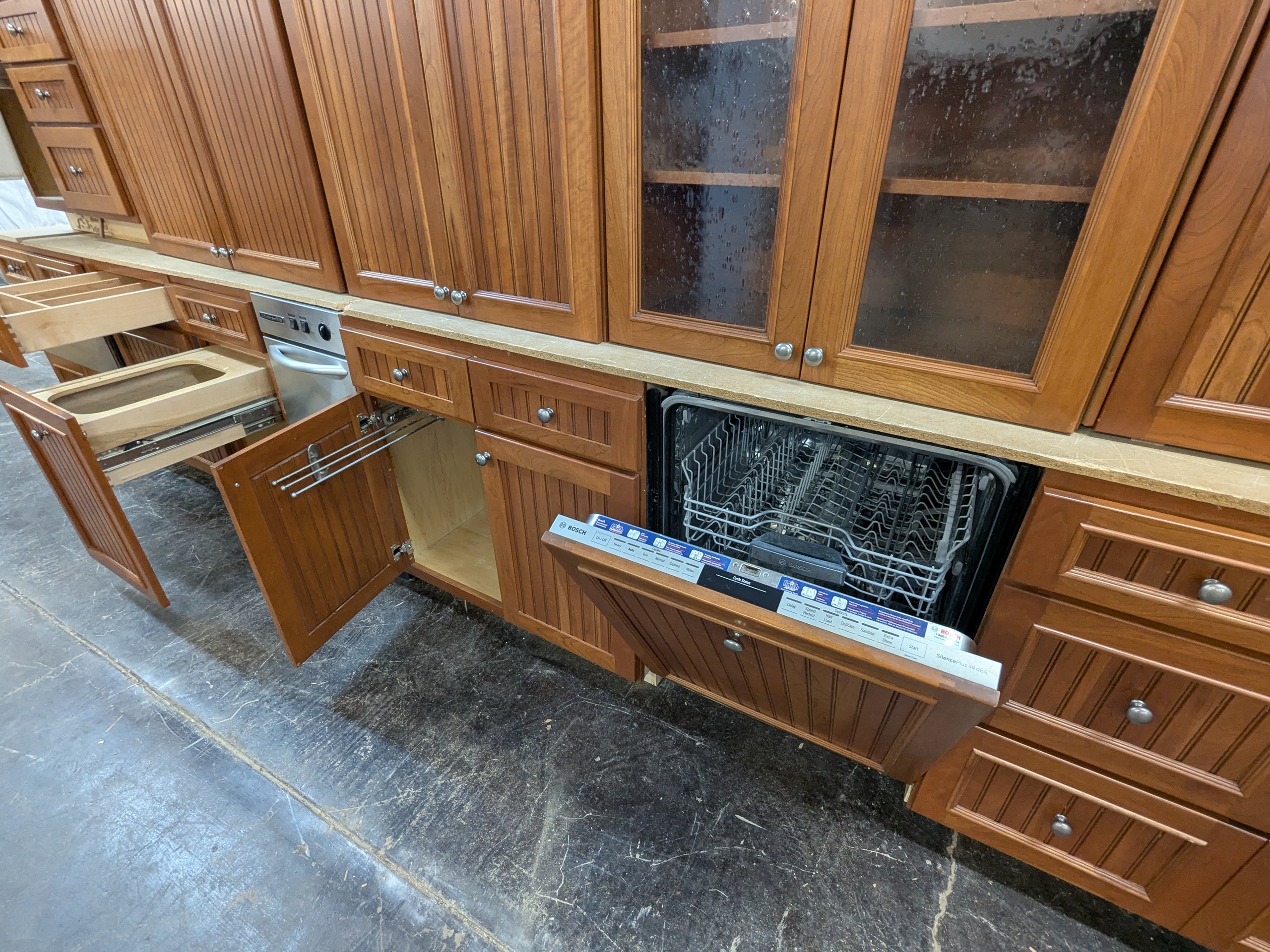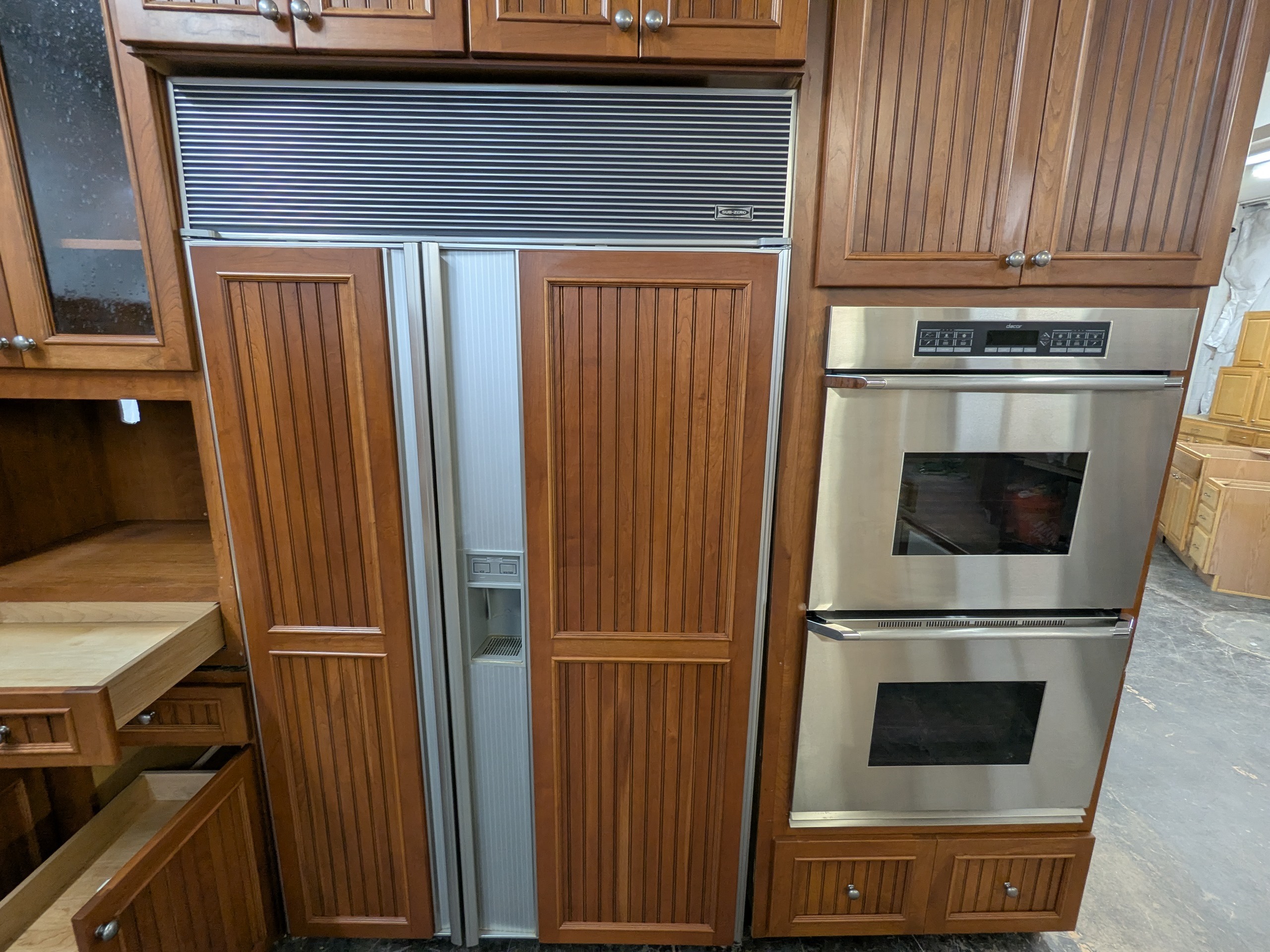 Extremely nice set of Crestwood kitchen cabinets with plywood boxes and dovetail drawers, beadboard door panels, rollout trays, multiple trash pullouts, utensil organizer, glass uppers, and nearly a full suite of mostly high-end appliances included with the set if you’d like them– trash compactor, stainless gas cooktop, stainless Dacor double wall oven, paneled Bosch dishwasher, warming drawer, and paneled Sub-Zero refrigerator.