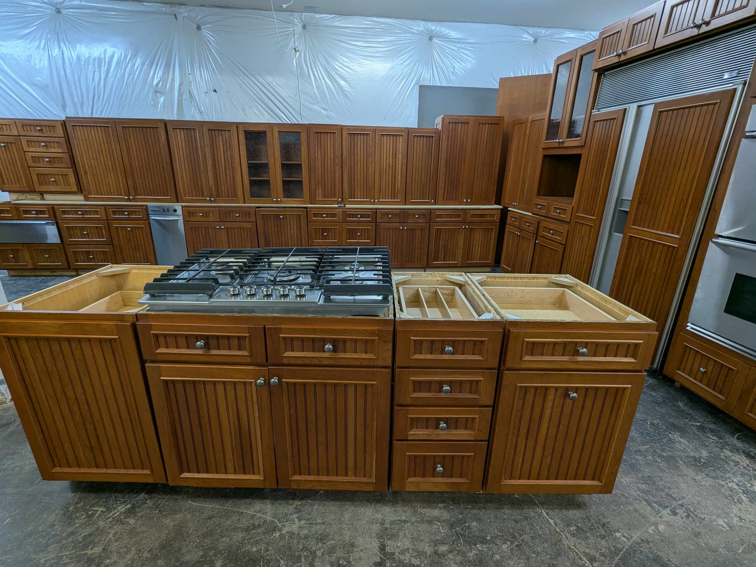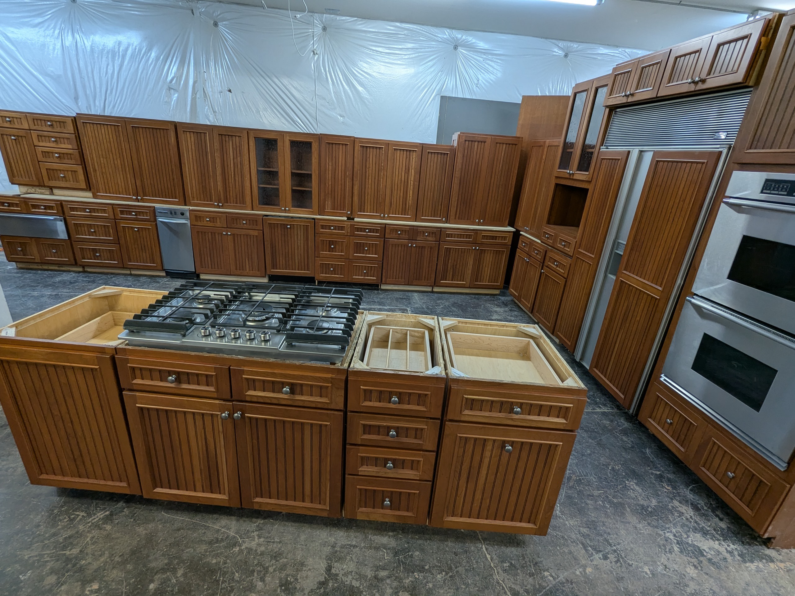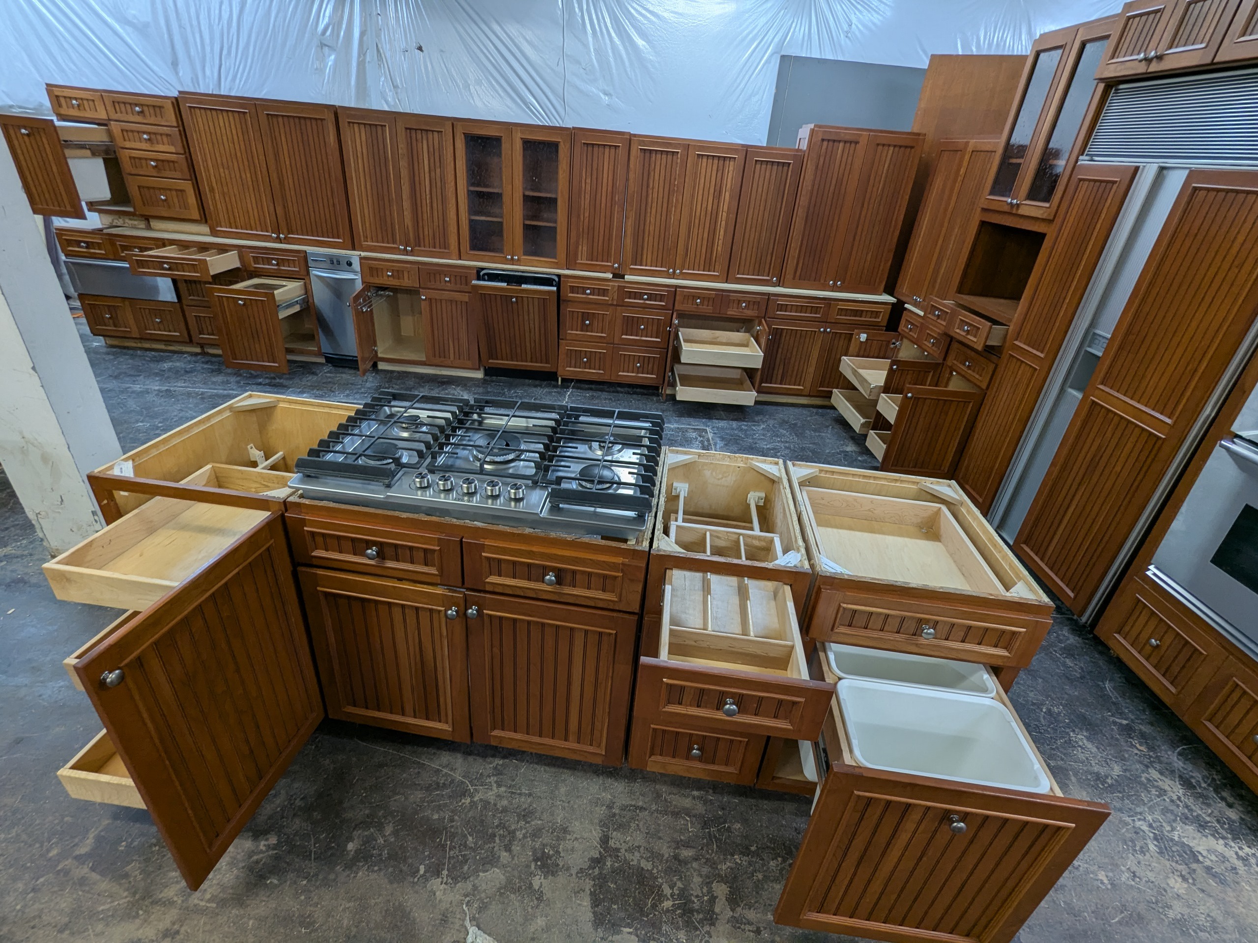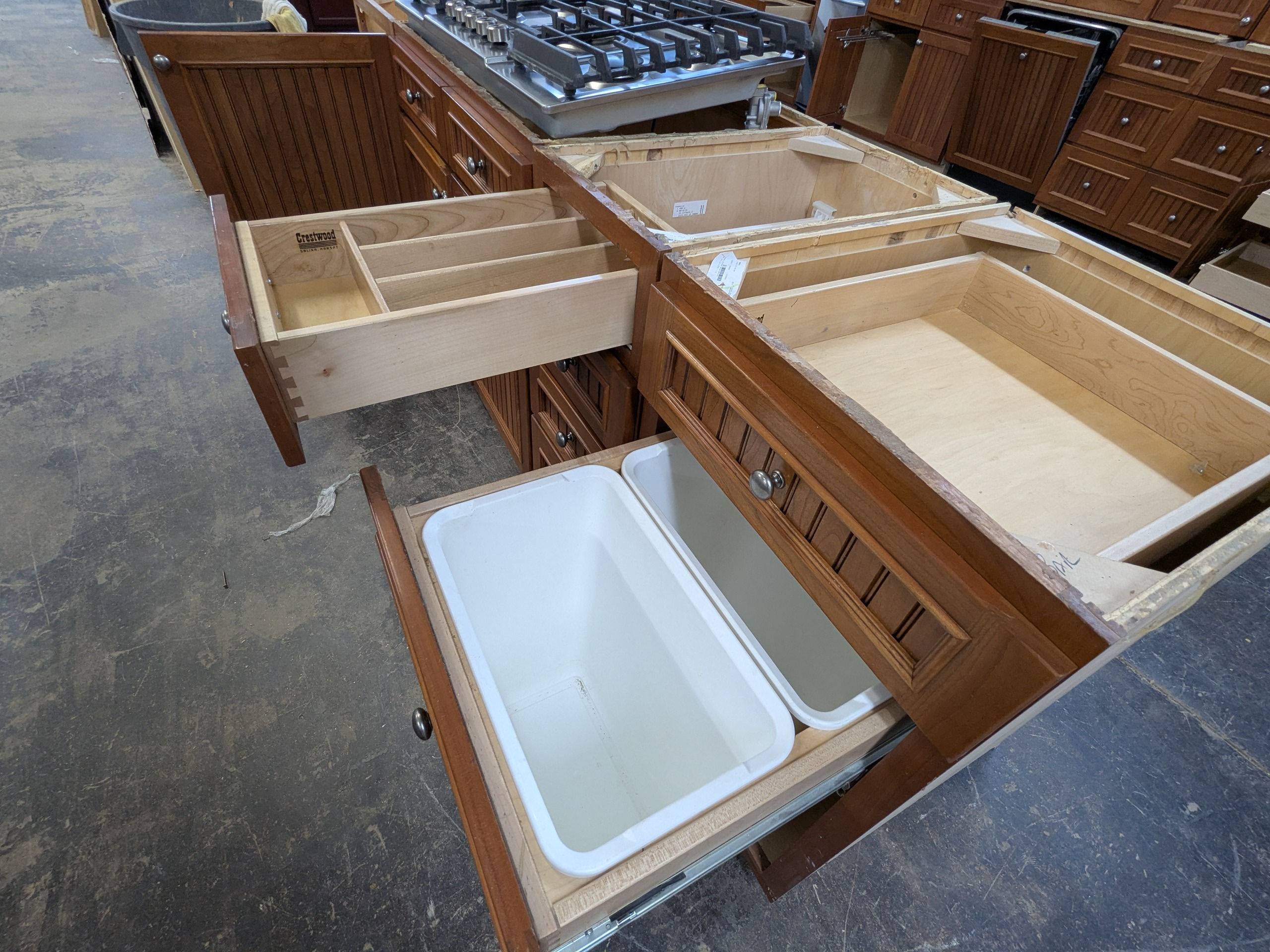Extremely nice set of Crestwood kitchen cabinets with plywood boxes and dovetail drawers, beadboard door panels, rollout trays, multiple trash pullouts, utensil organizer, glass uppers, and nearly a full suite of mostly high-end appliances included with the set if you’d like them– trash compactor, stainless gas cooktop, stainless Dacor double wall oven, paneled Bosch dishwasher, warming drawer, and paneled Sub-Zero refrigerator.
