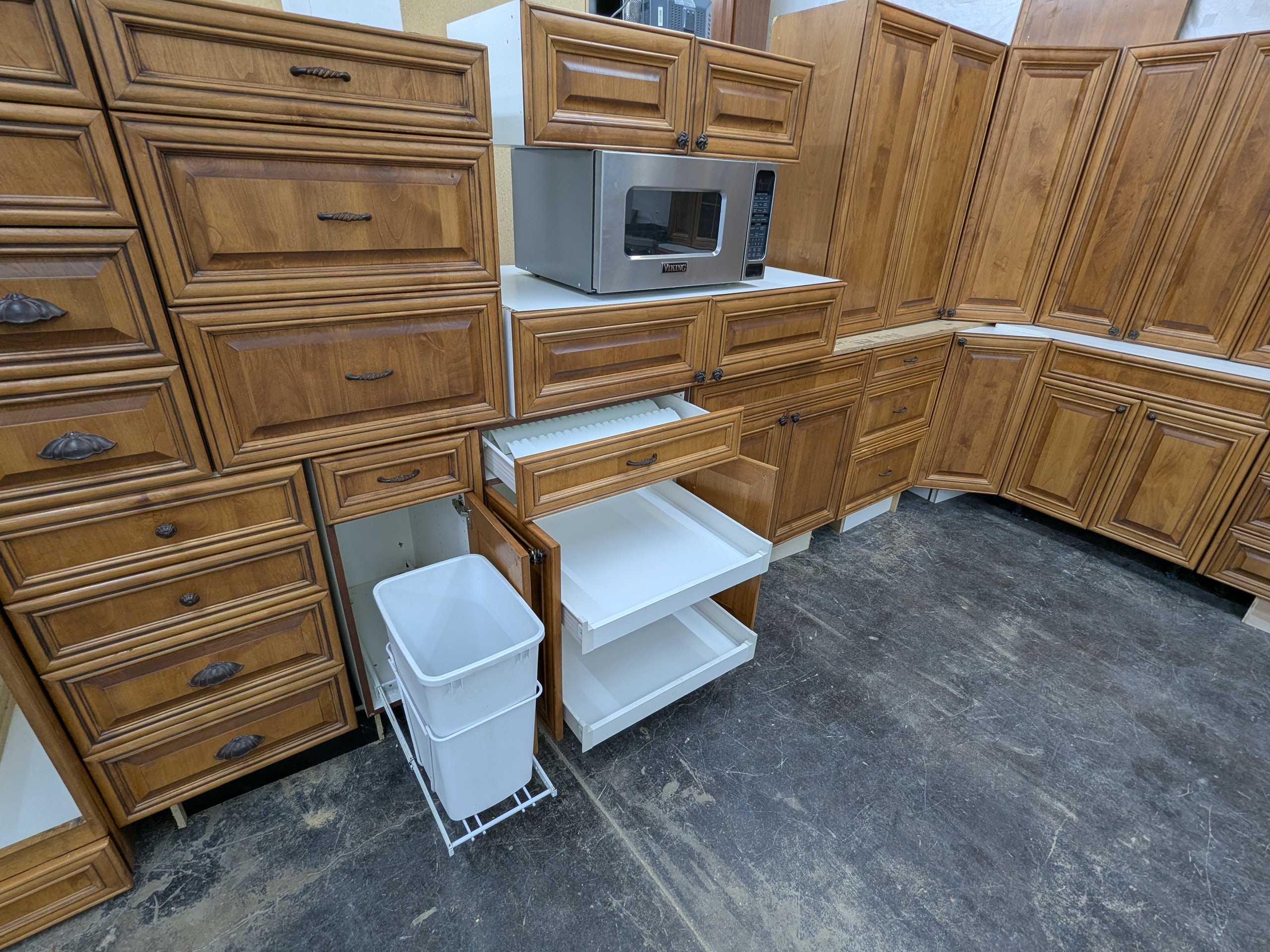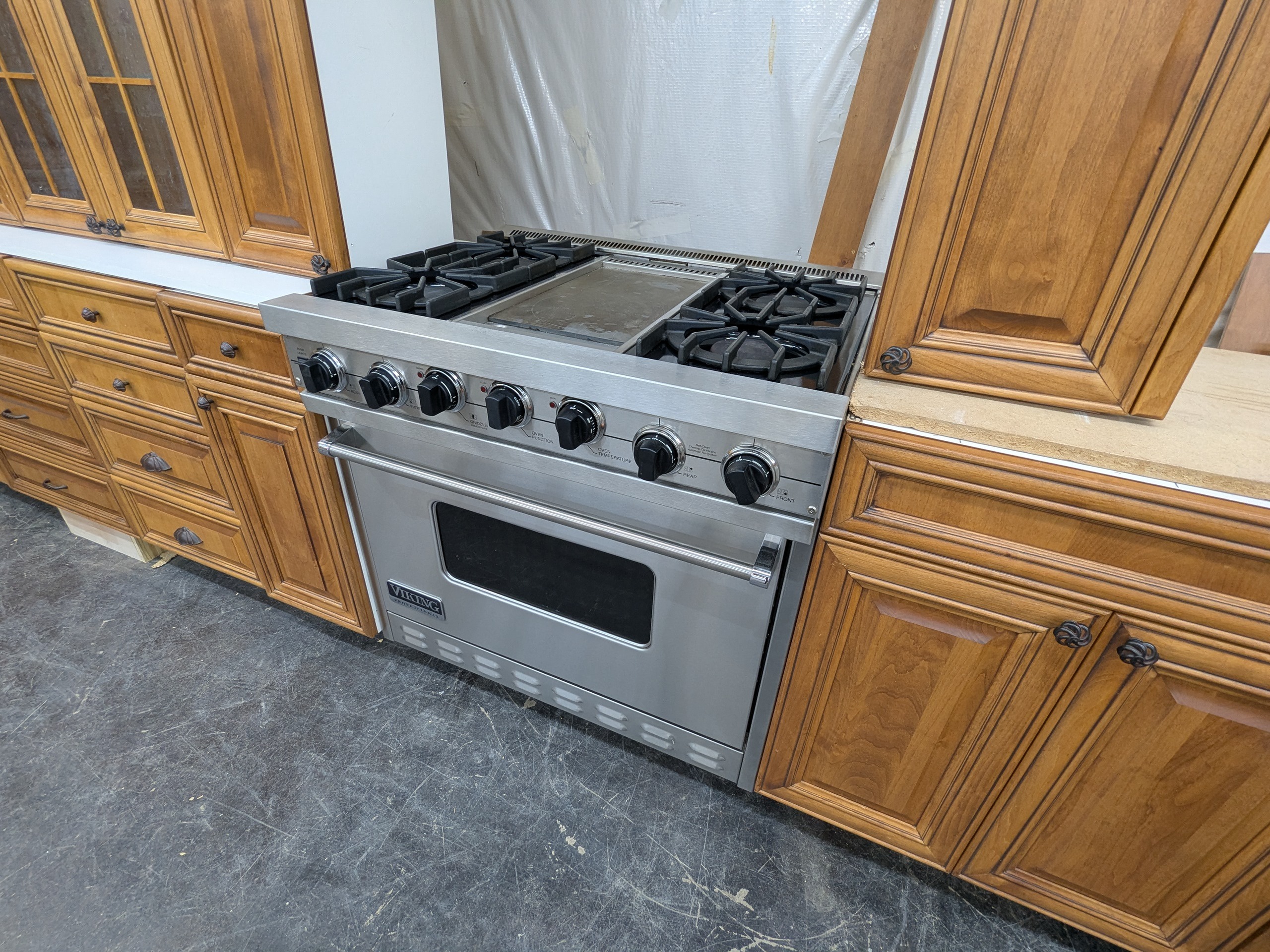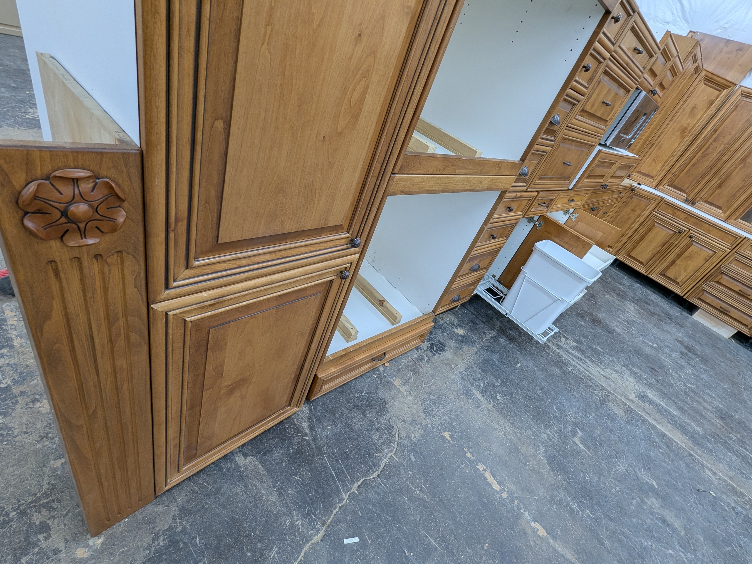 Kamtz frameless lightly rustic used kitchen cabinets with pantry, huge lazy susan, seeded glass uppers with mullions, trash pullout, rollout trays, drawer insert spice rack, a Viking gas range (and stainless vent hood and microwave thrown in for free), and some slab granite countertops.