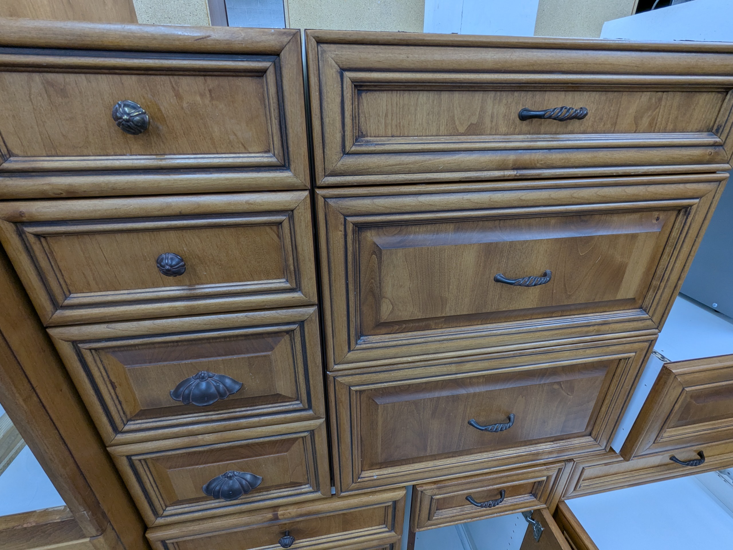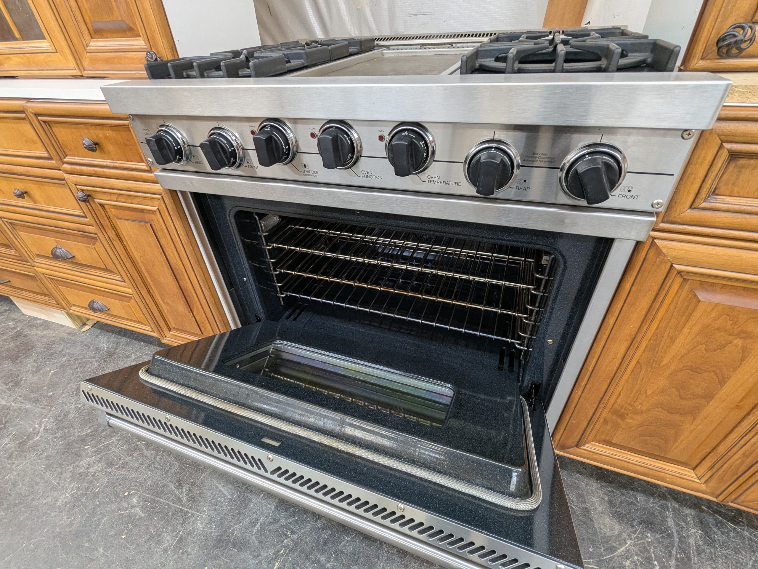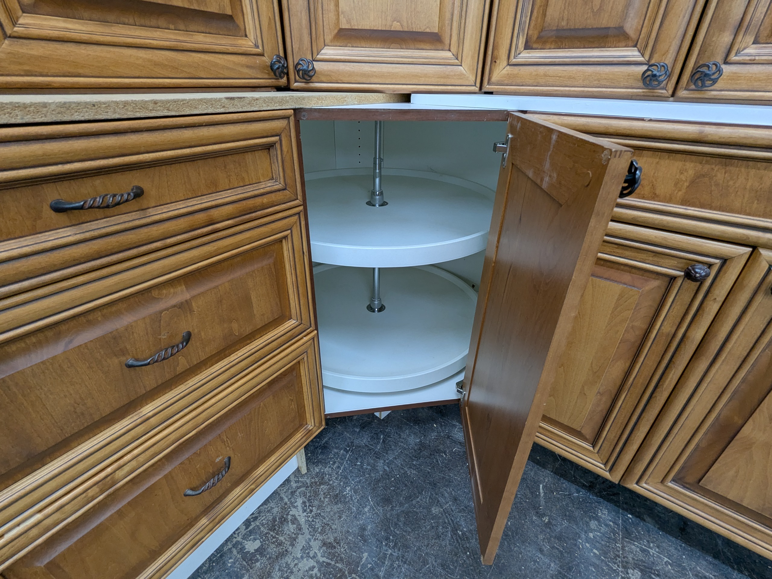 Kamtz frameless lightly rustic used kitchen cabinets with pantry, huge lazy susan, seeded glass uppers with mullions, trash pullout, rollout trays, drawer insert spice rack, a Viking gas range (and stainless vent hood and microwave thrown in for free), and some slab granite countertops.