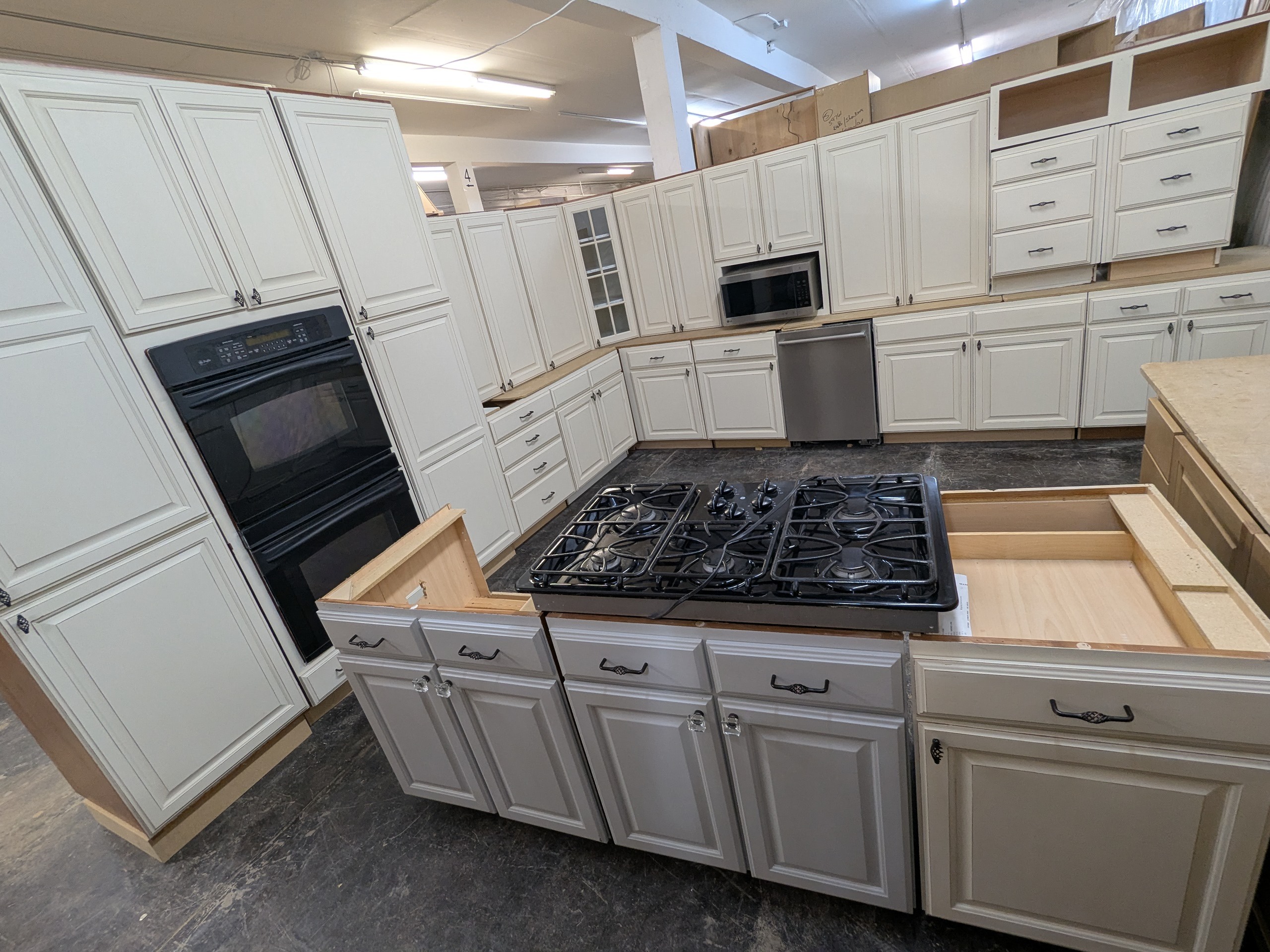 Antiqued used kitchen cabinets by Mastercraft with corner glass upper with mullions, two pantries, and rollout trays. There are also some appliances included with the set for free– double wall oven, microwave, gas cooktop, and dishwasher.