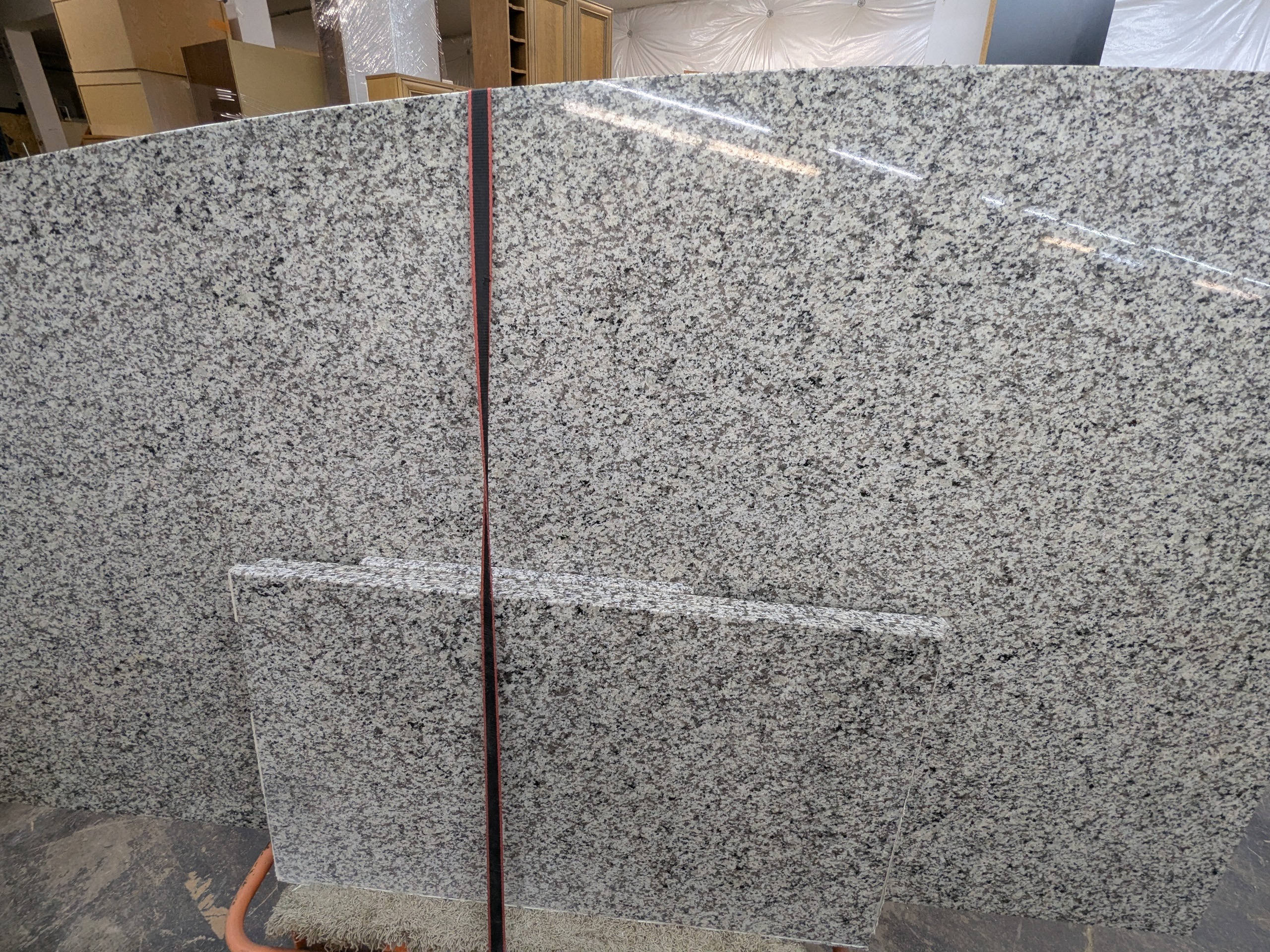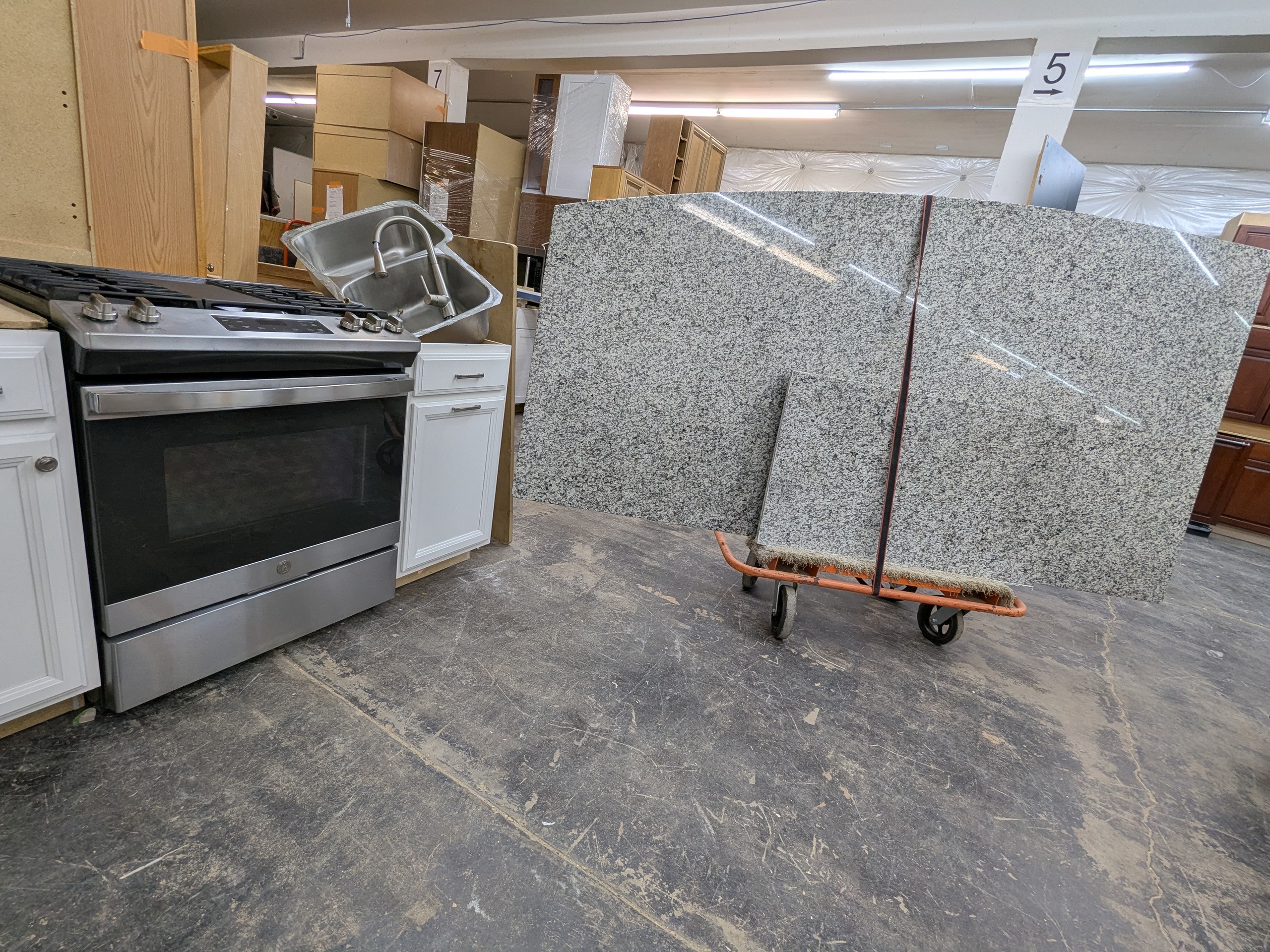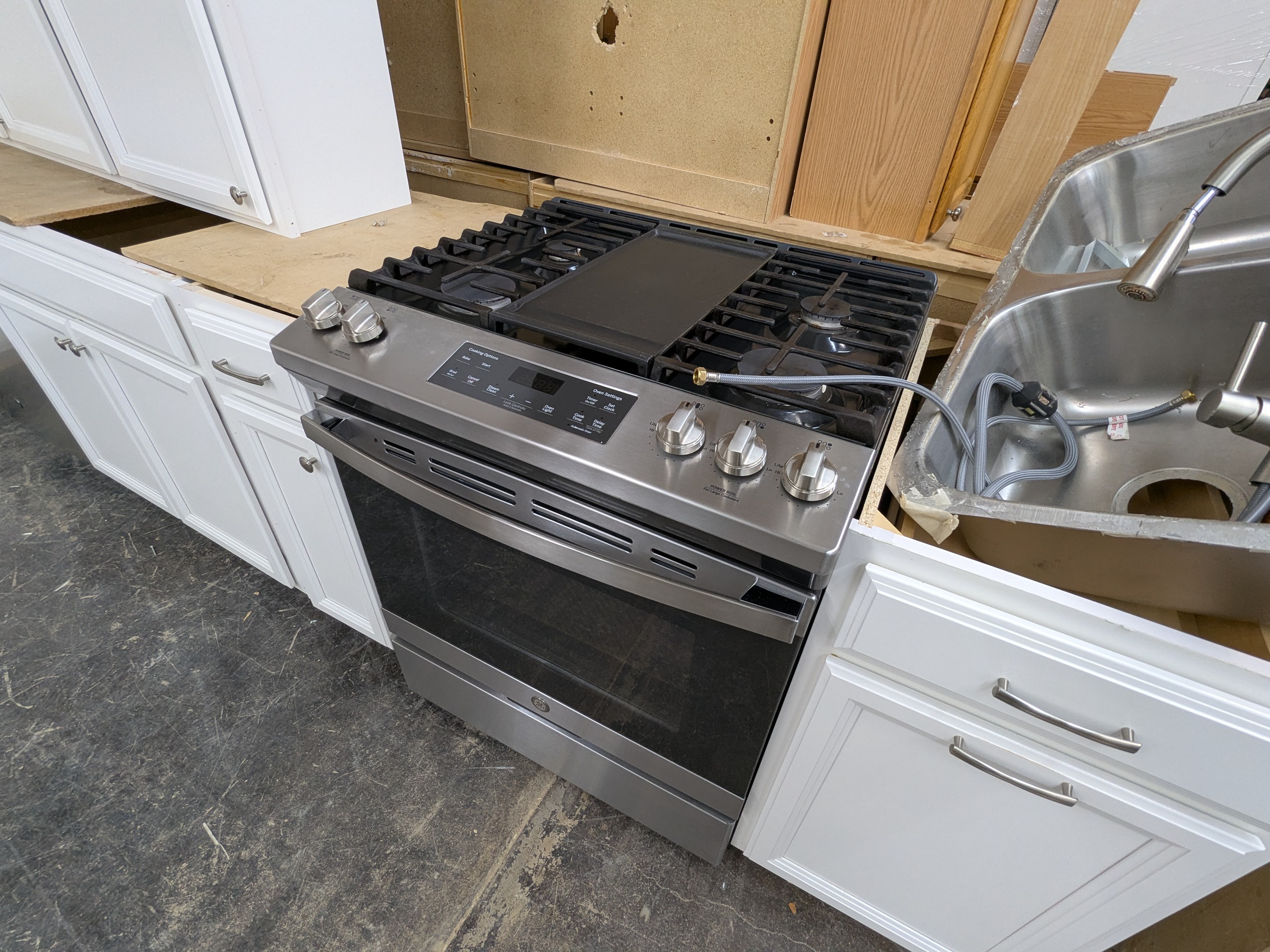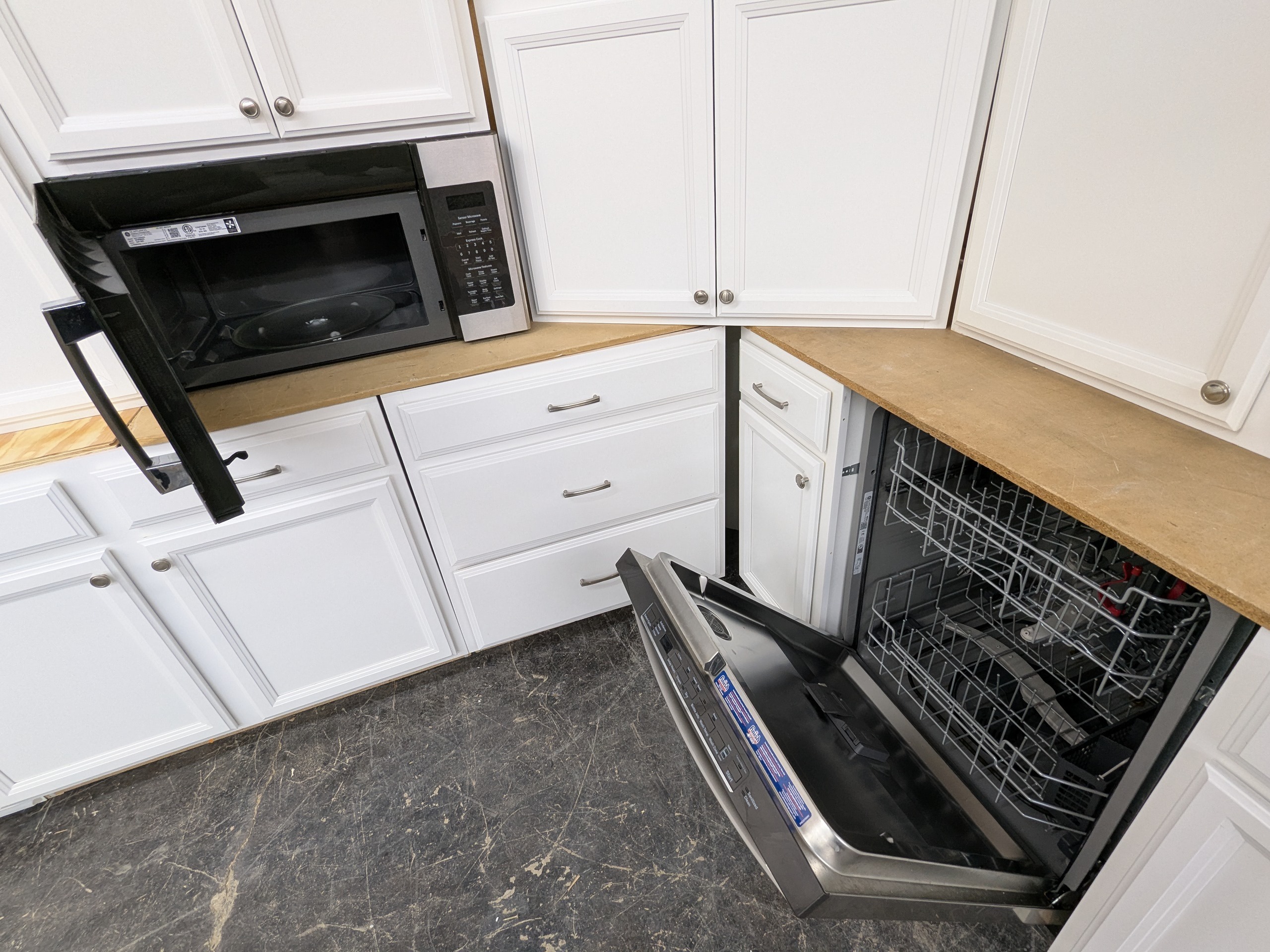 White used kitchen cabinets with trash pullout, brushed nickel hardware, stainless appliances (microwave, dishwasher, slide-in gas range), and all the intact slab granite countertops.