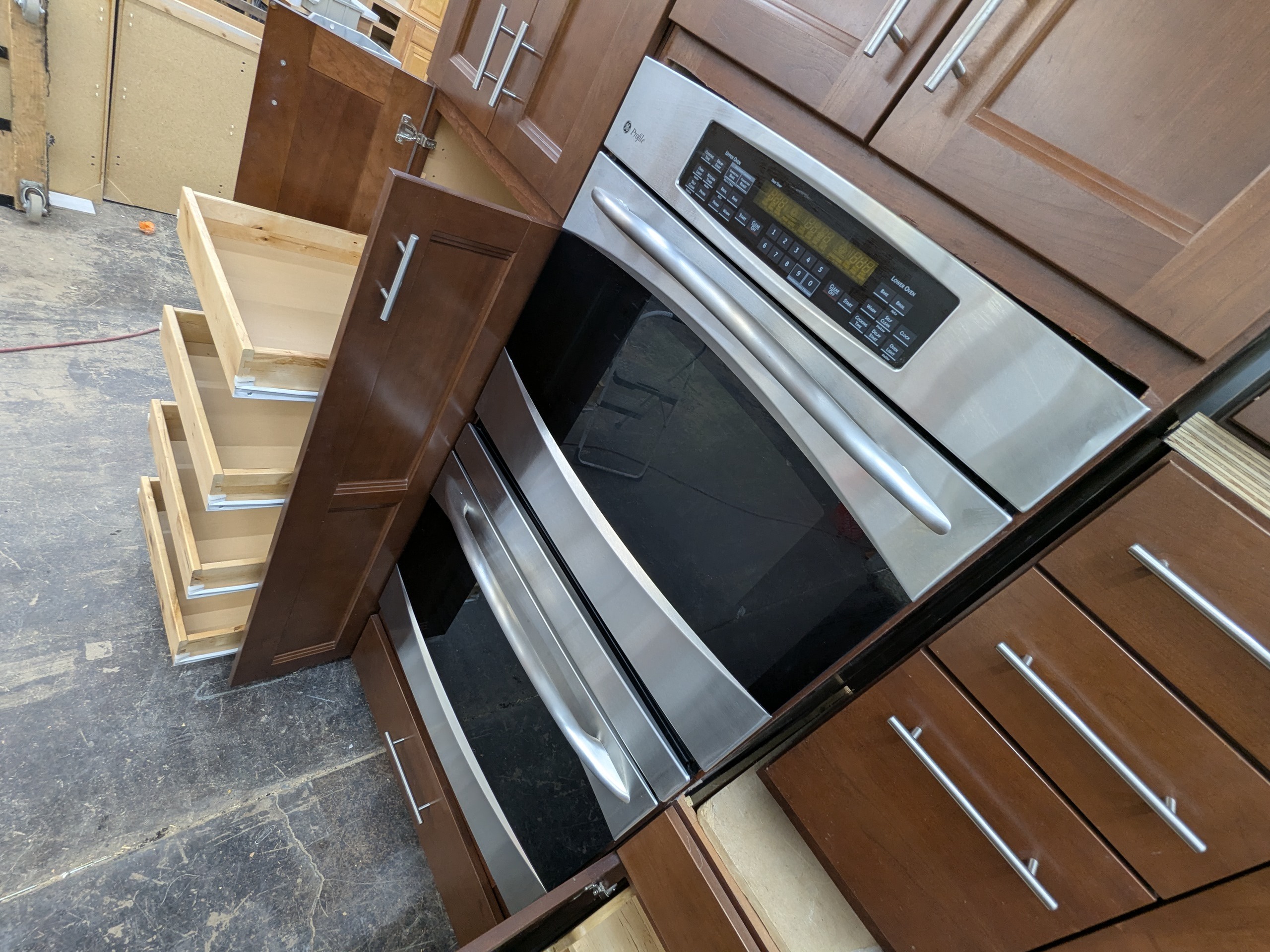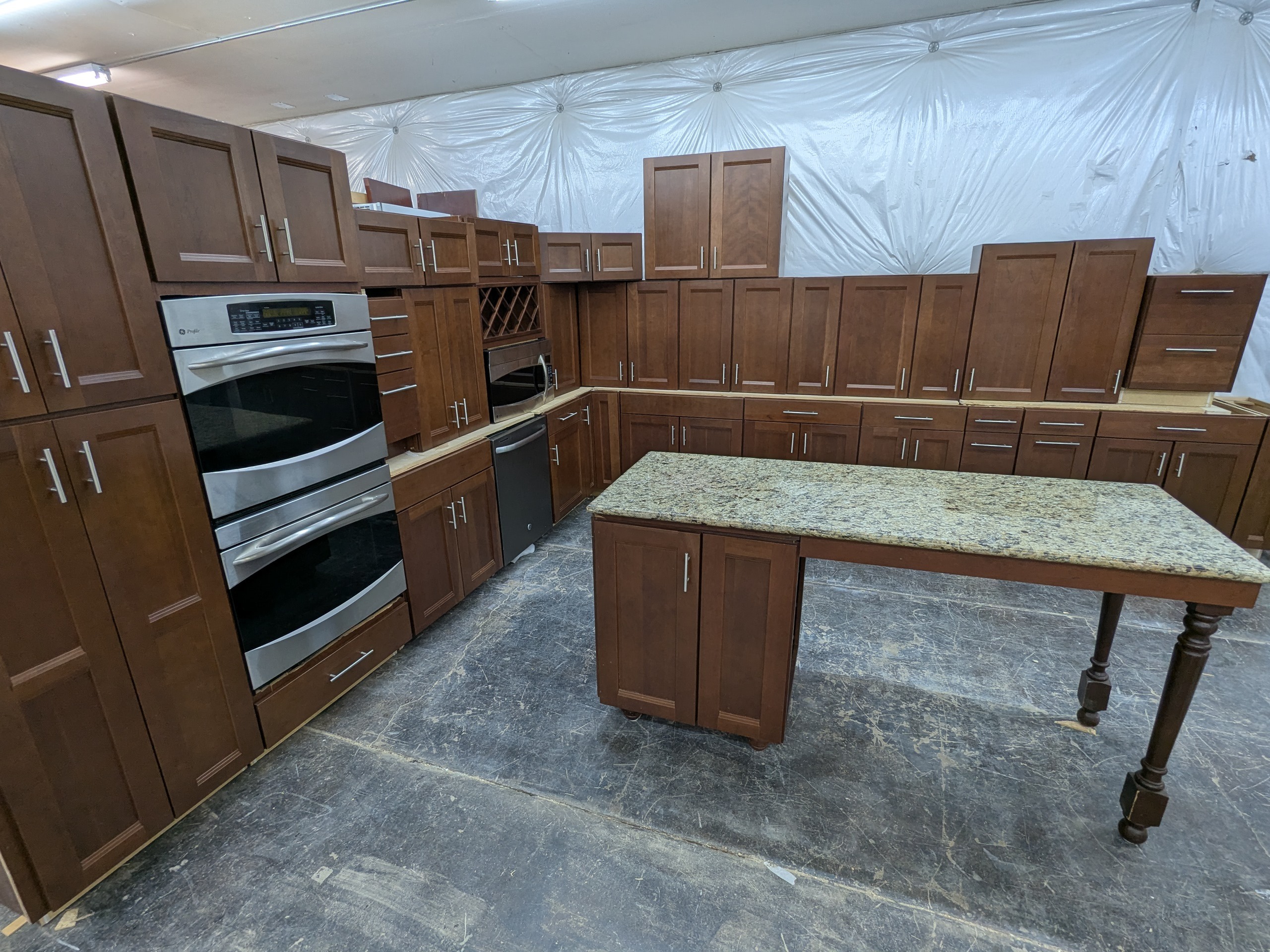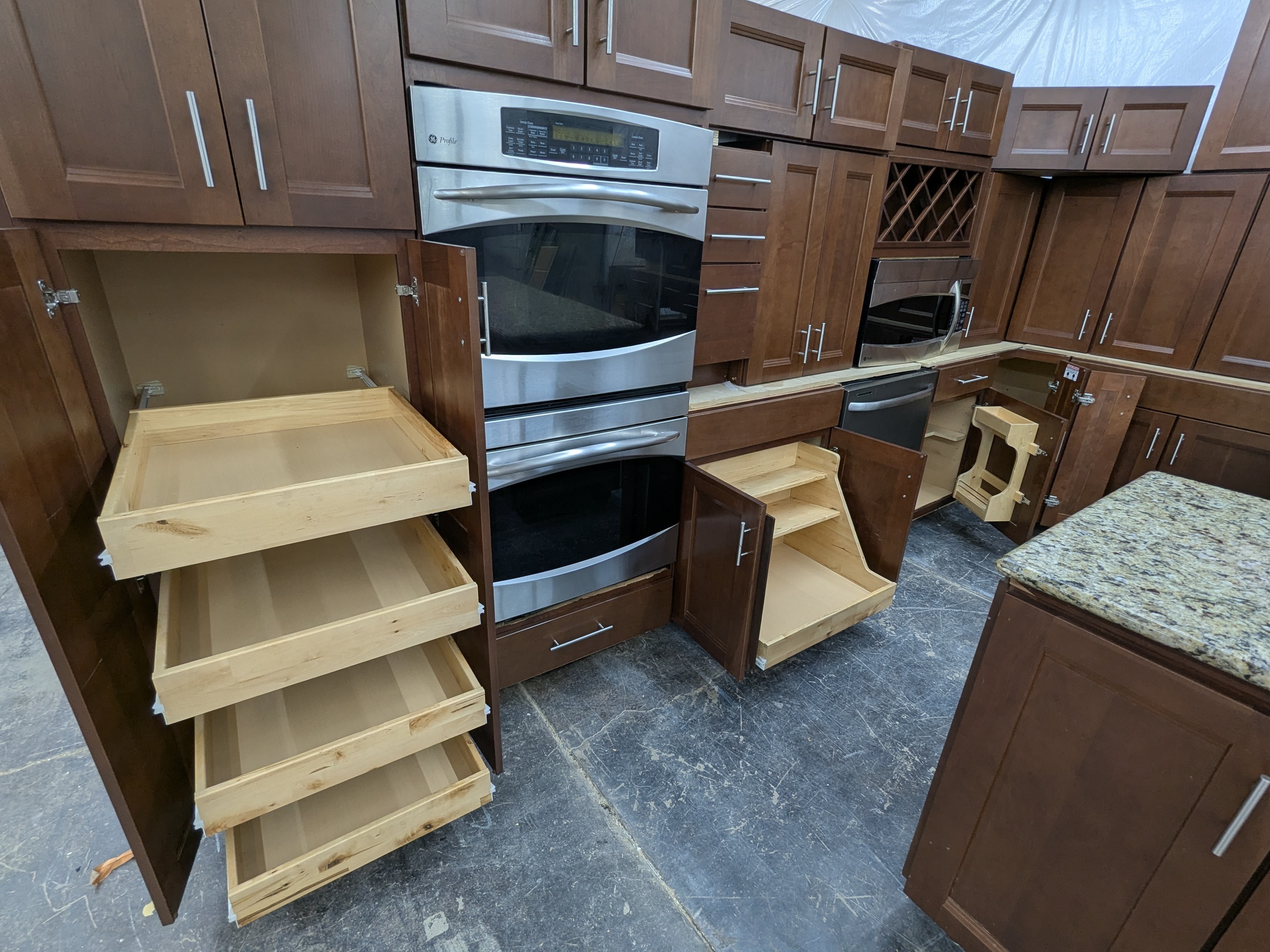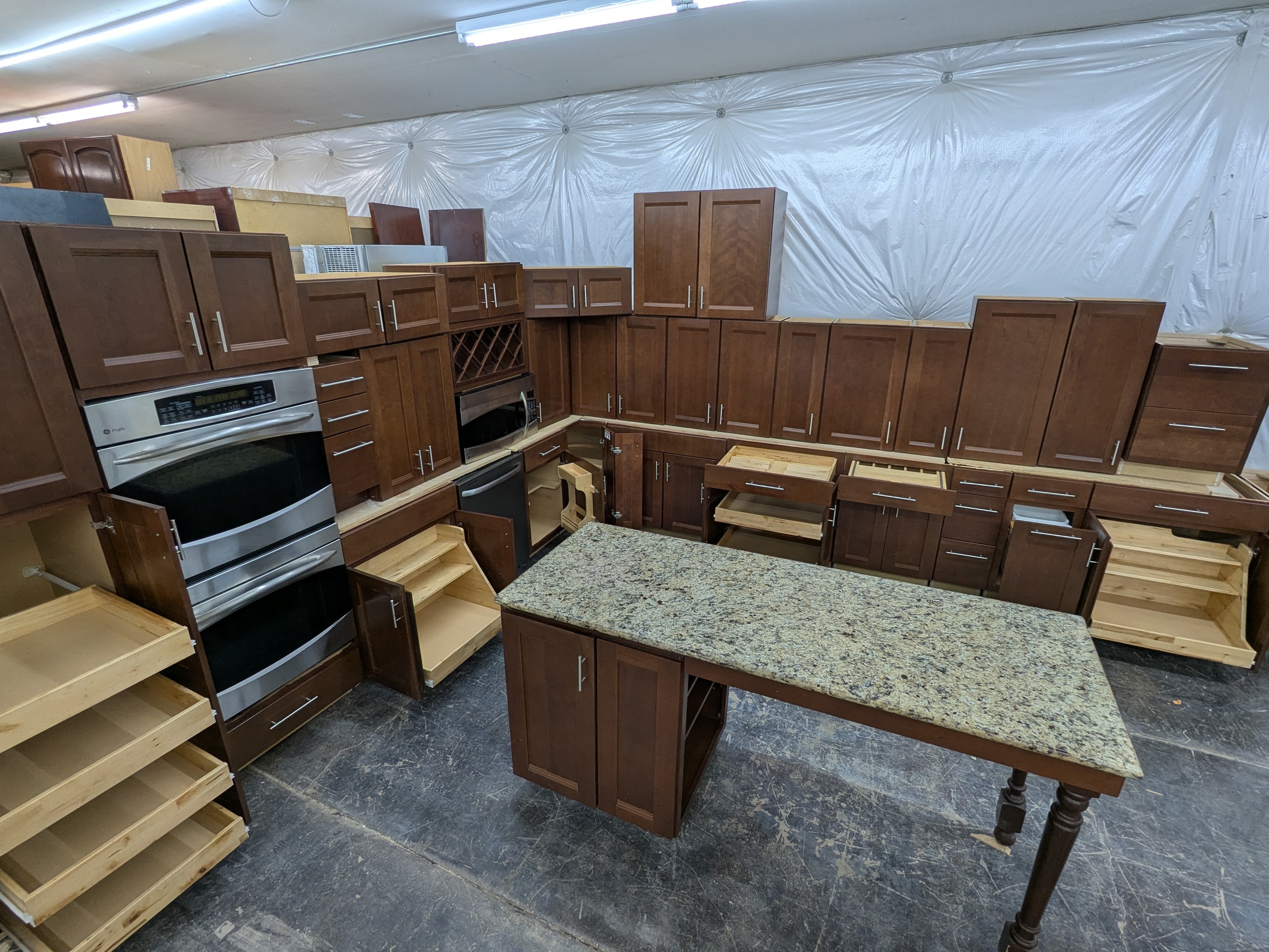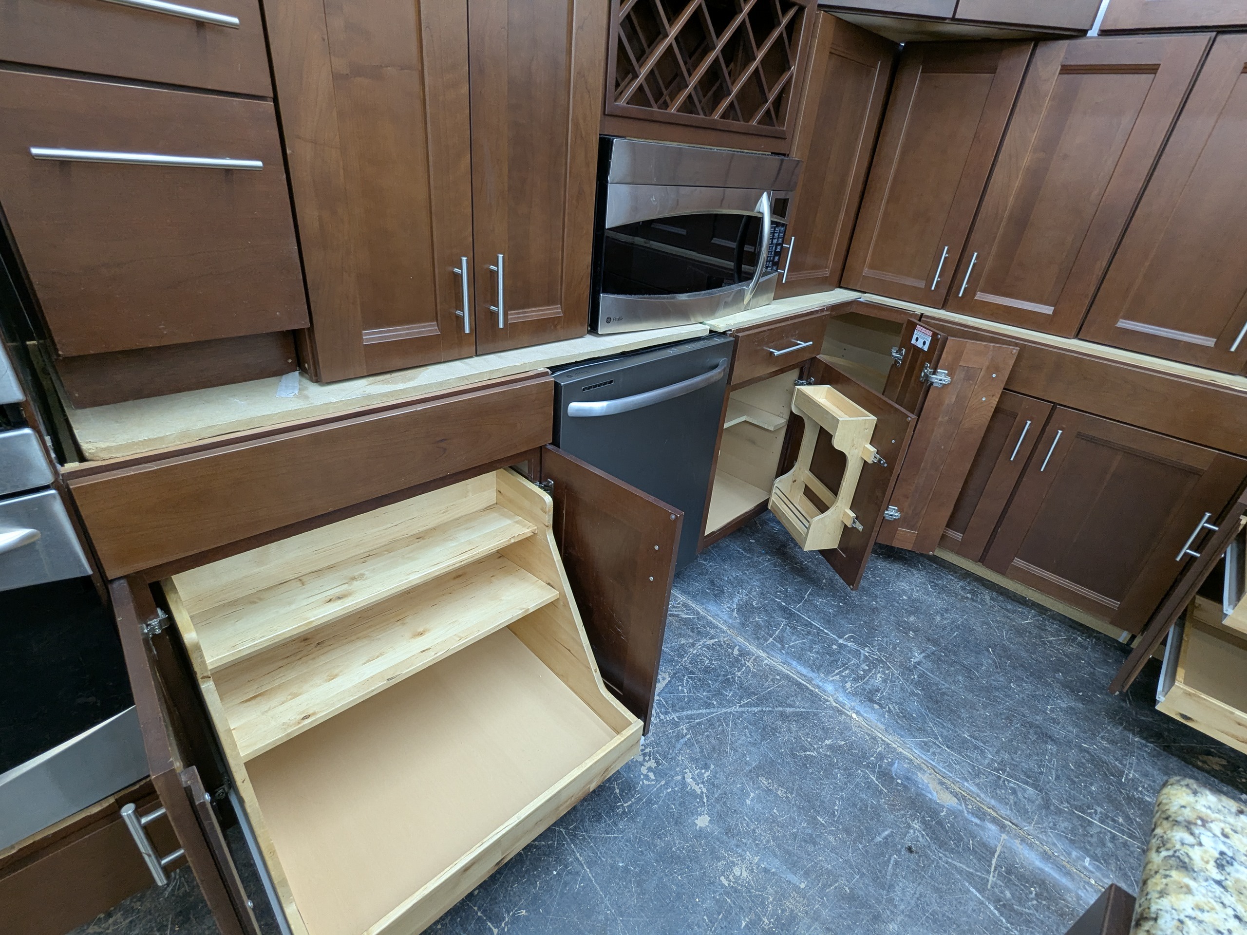 Used kitchen cabinets with dovetail and soft close drawers and lots of cool features– two oversized rollouts, double trash pullout, wine rack, super susan, pantry cabinet with rollout trays, door hanging spice rack, drawer insert spice rack, base cabinet rollout trays, a two-tier drawer utensil organizer, and an island package complete with slab granite countertop. Plus, there are a few stainless appliances thrown in for free as well if you’d like them.