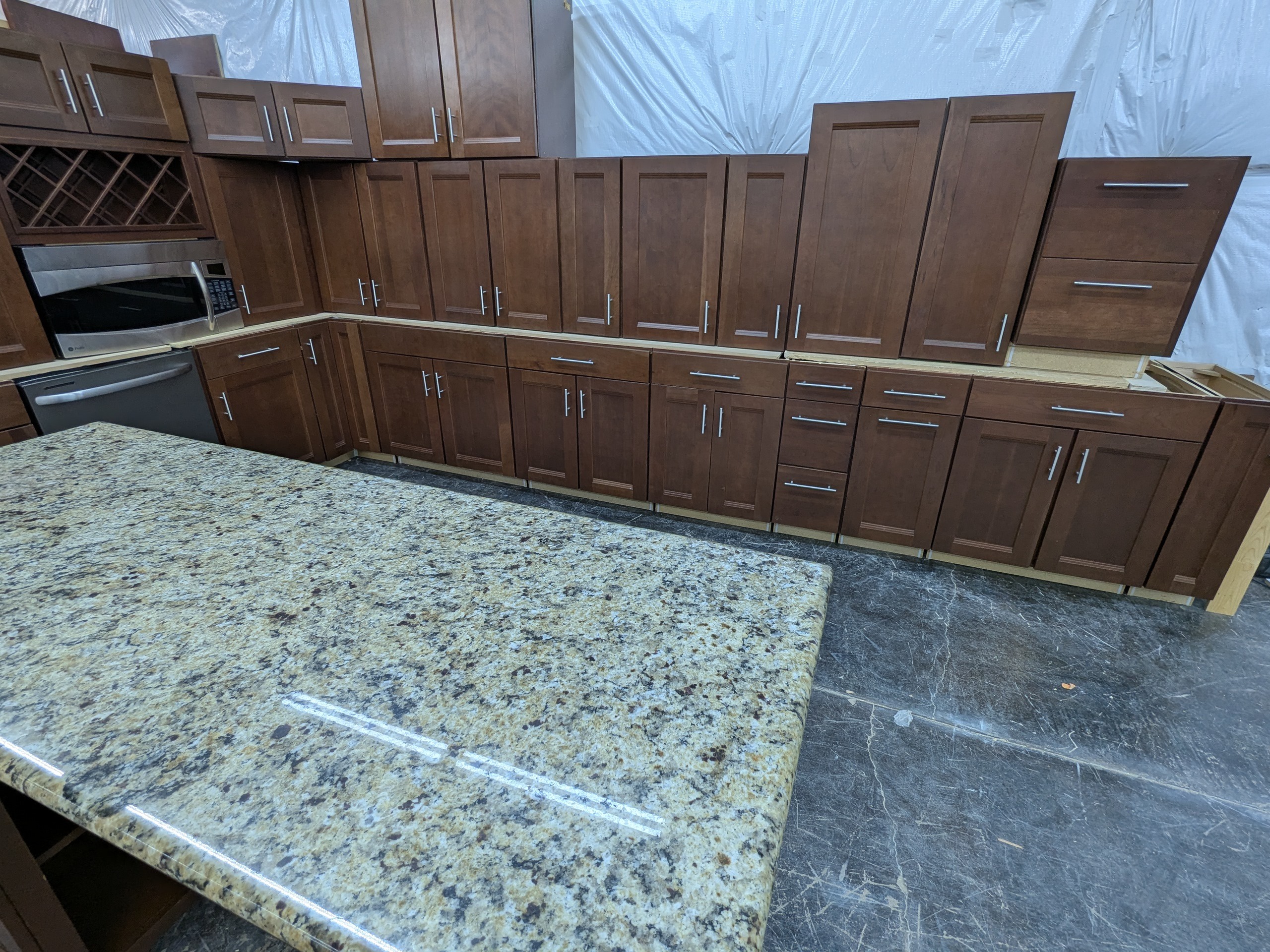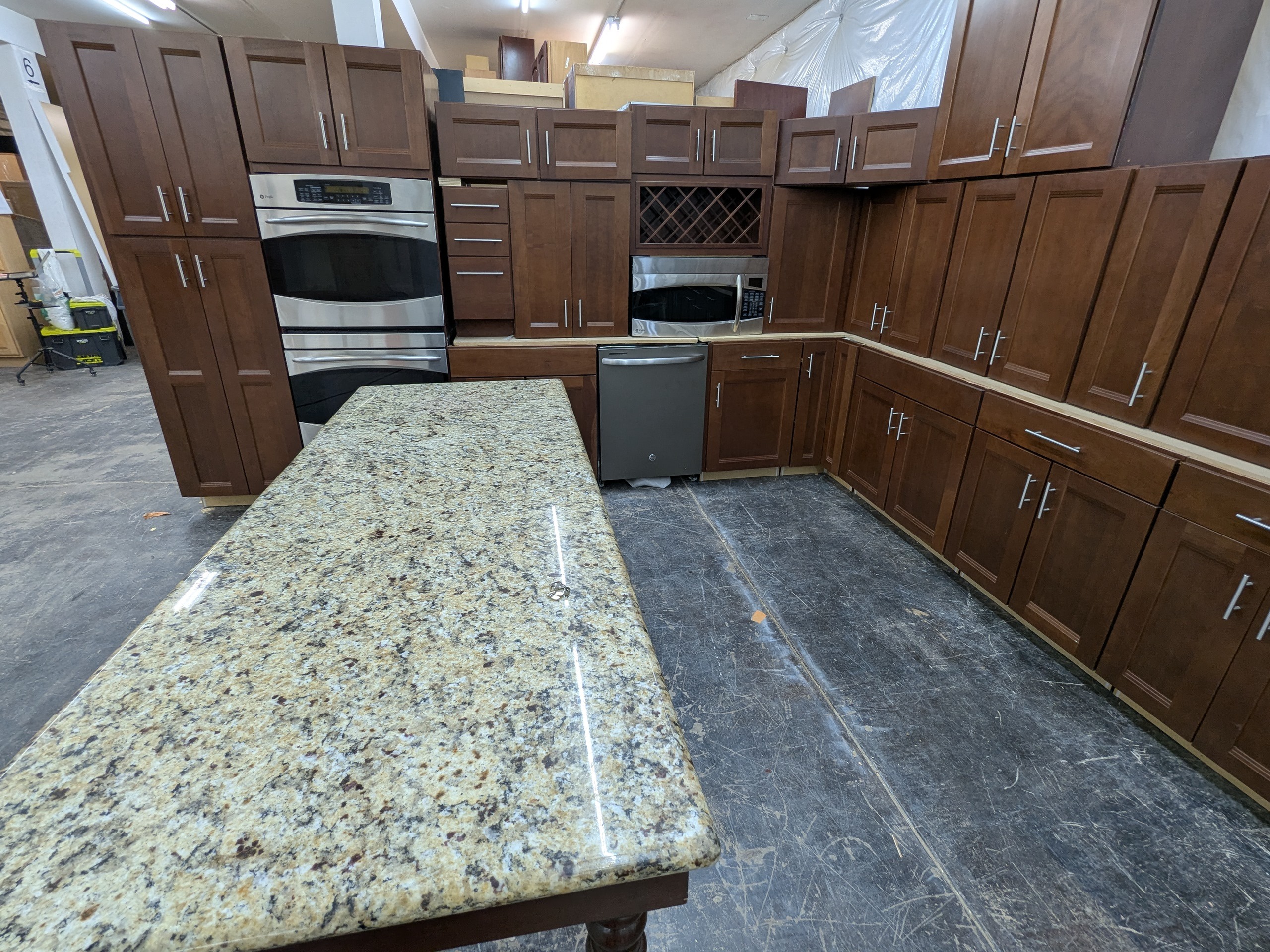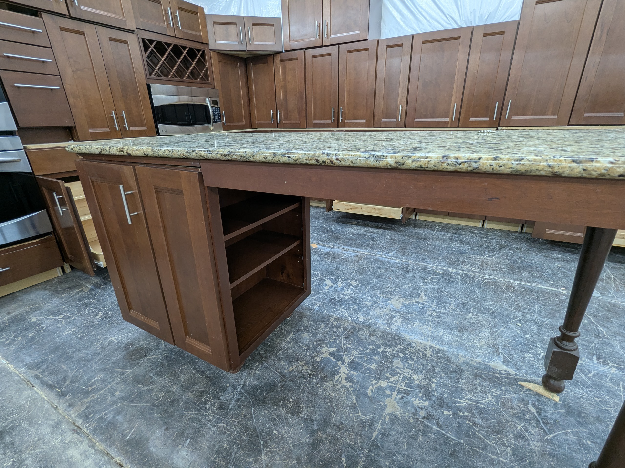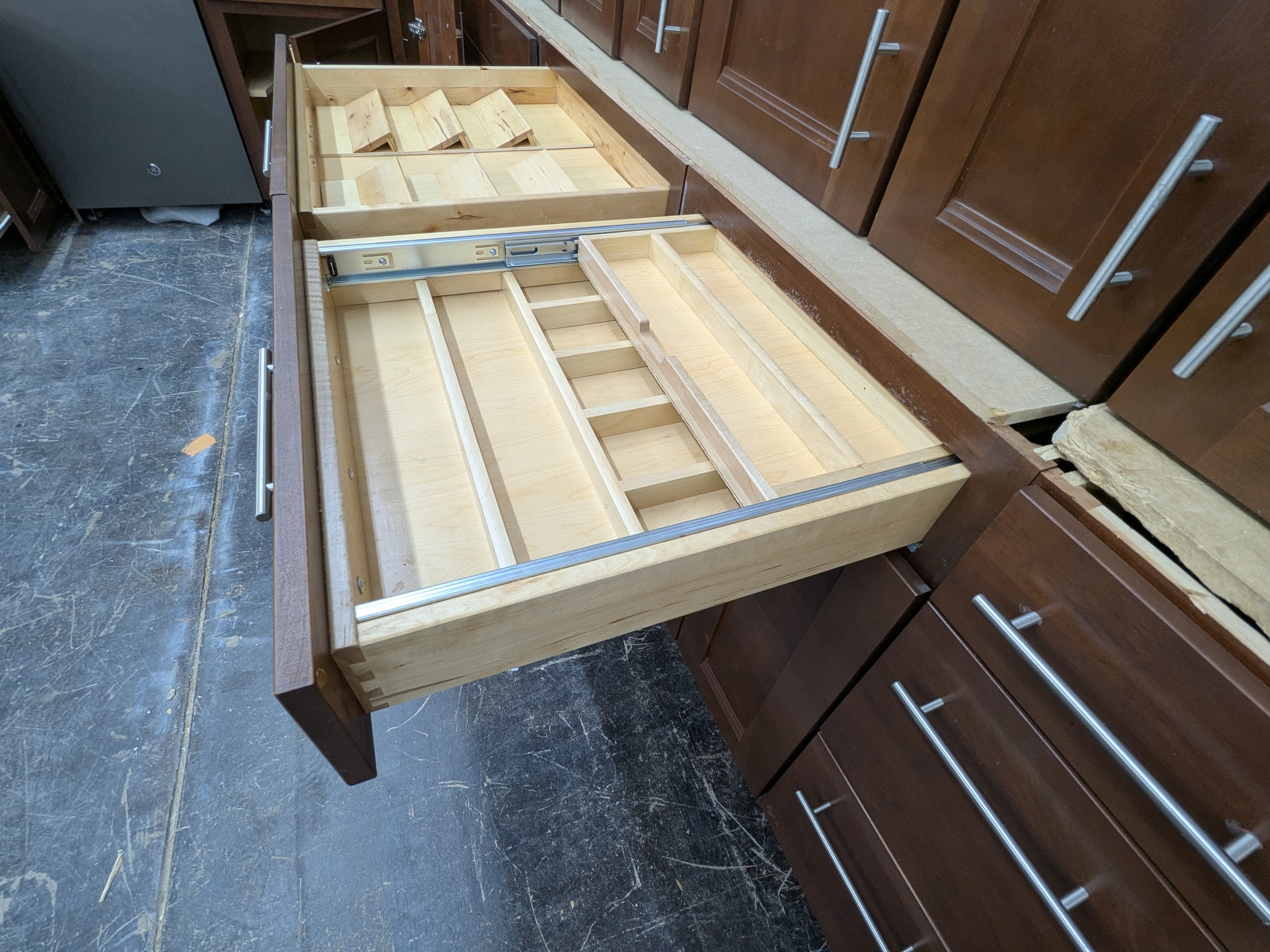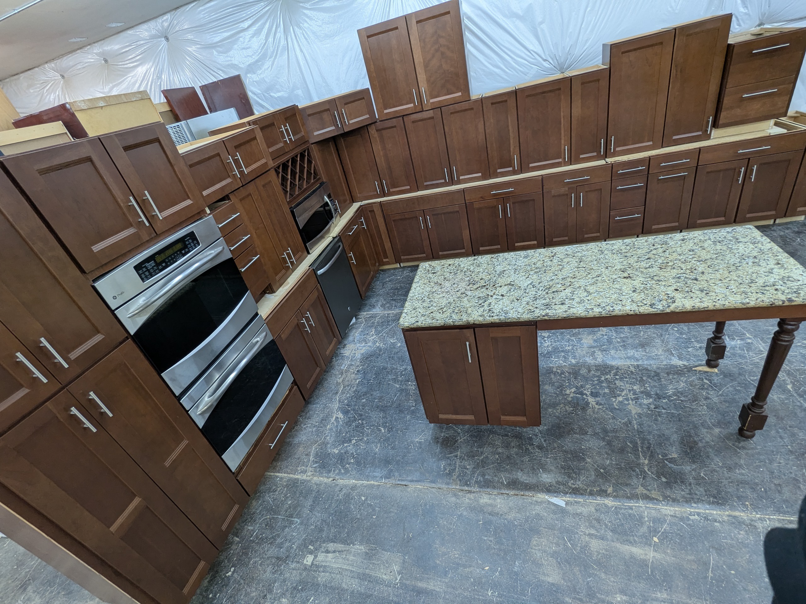 Used kitchen cabinets with dovetail and soft close drawers and lots of cool features– two oversized rollouts, double trash pullout, wine rack, super susan, pantry cabinet with rollout trays, door hanging spice rack, drawer insert spice rack, base cabinet rollout trays, a two-tier drawer utensil organizer, and an island package complete with slab granite countertop. Plus, there are a few stainless appliances thrown in for free as well if you’d like them.
