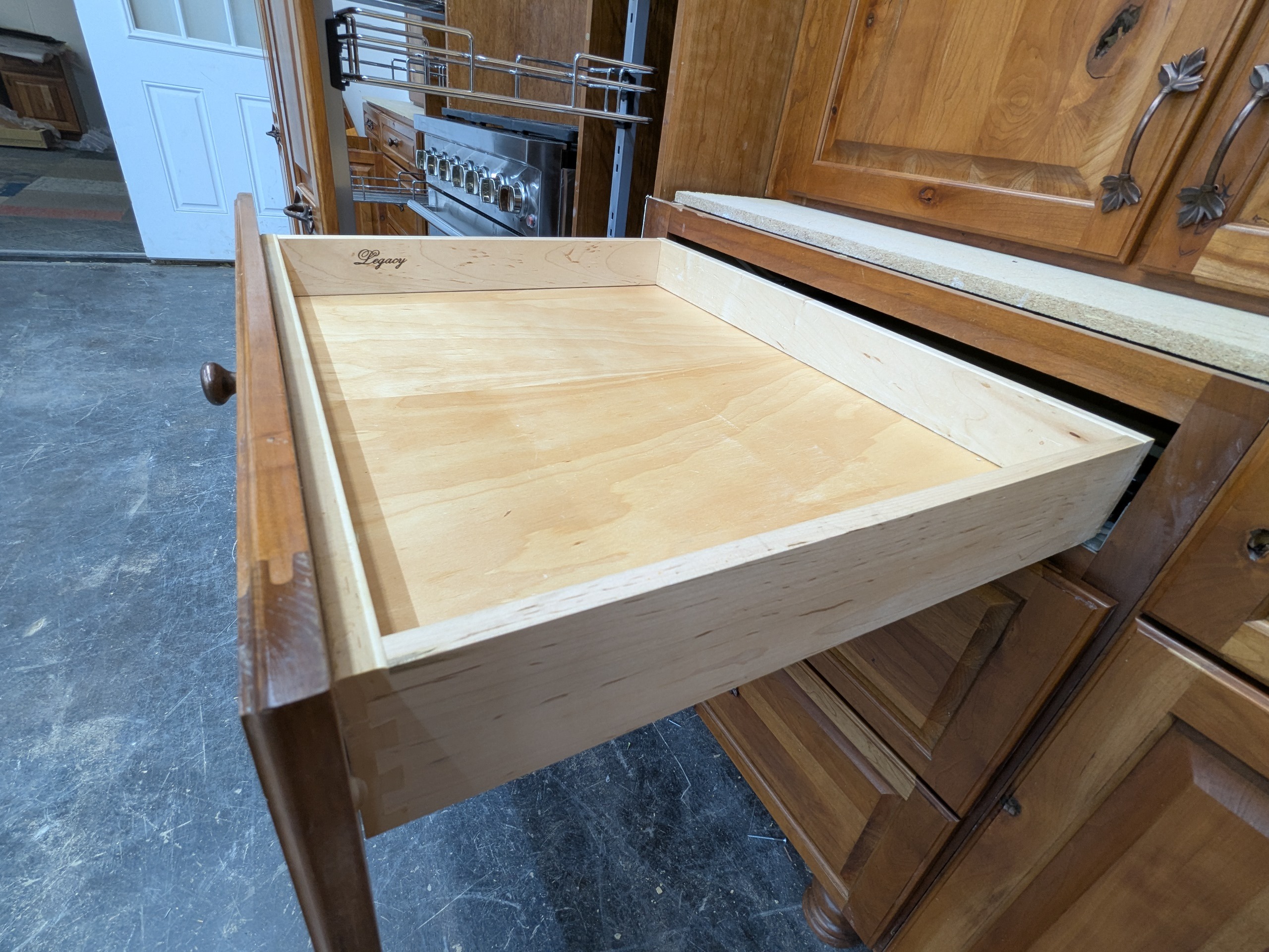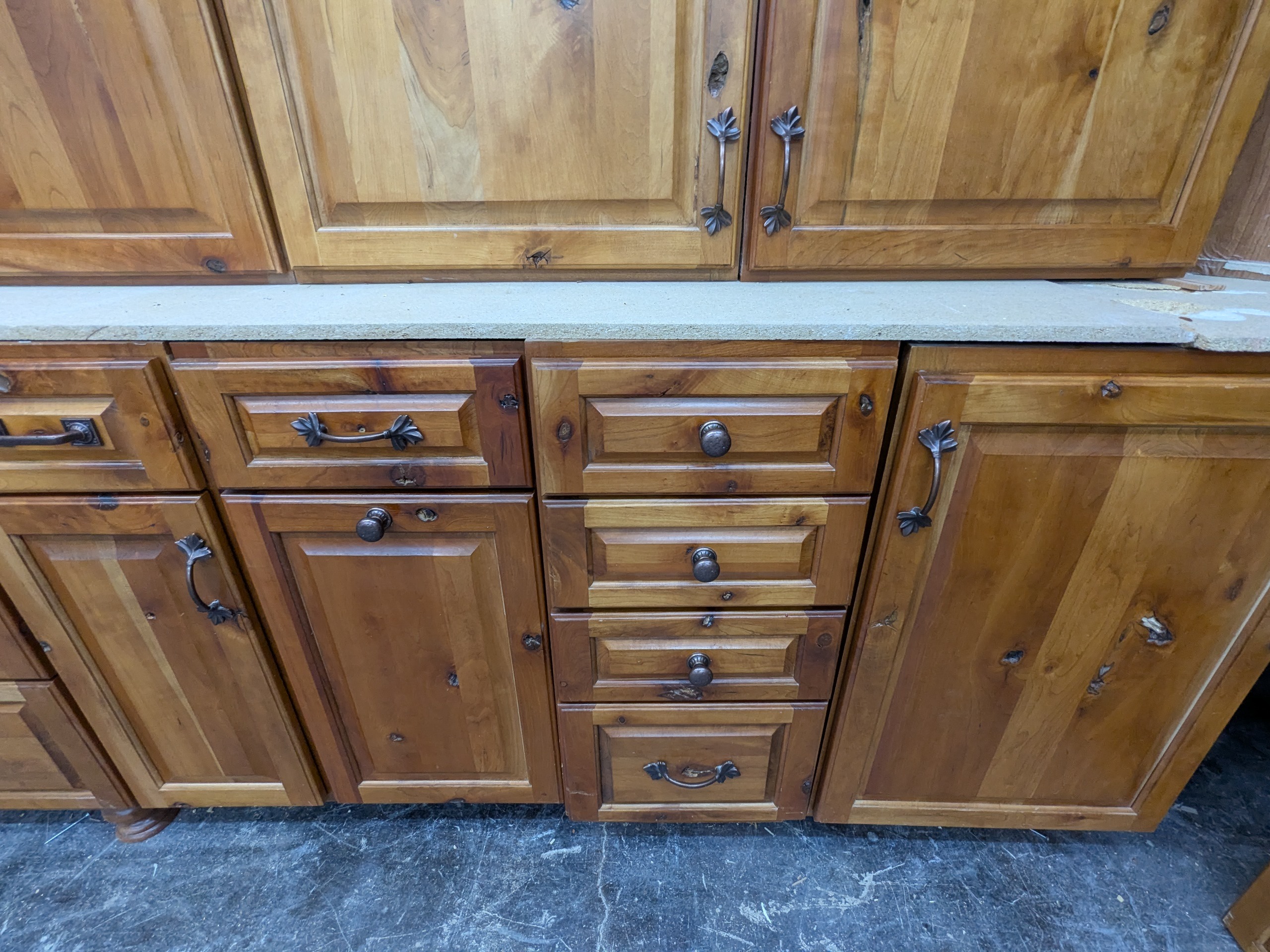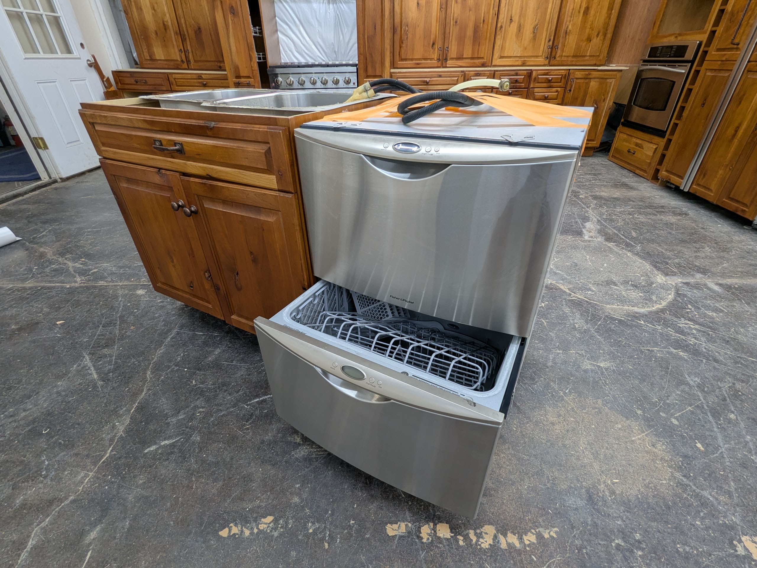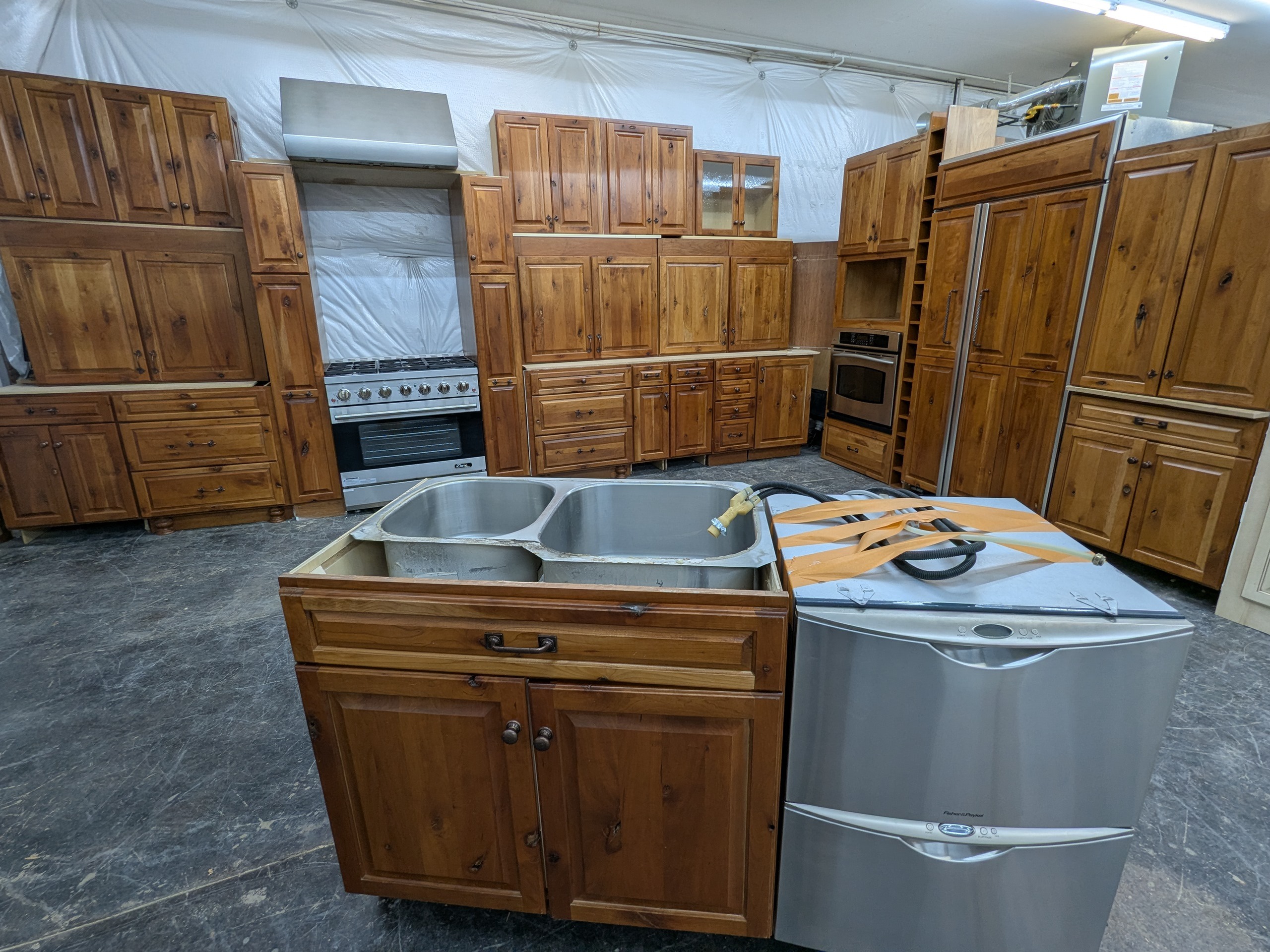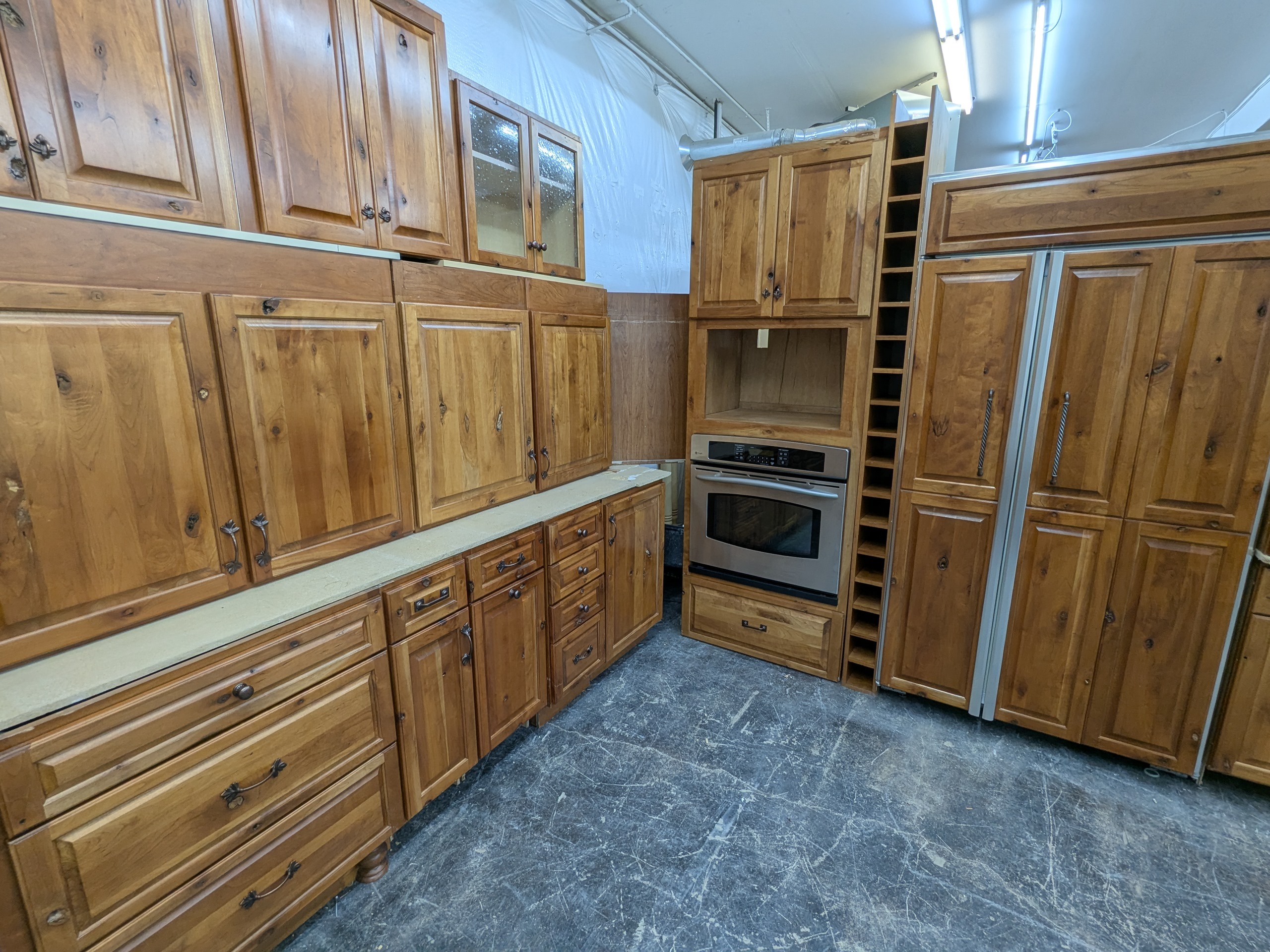 Gorgeous rustic knotty used kitchen cabinets with dovetail drawers and plywood boxes by Legacy Cabinets. Other features include seeded glass, wine rack, rollout trays, utensil divider, multiple pantry cabinets, and two tall spice rack style pullouts flanking the range. Speaking of the appliances, this package also includes a paneled Monogram refrigerator, Fisher and Paykel drawer dishwasher, single wall oven, and a basically brand new gas range (range hood not included).