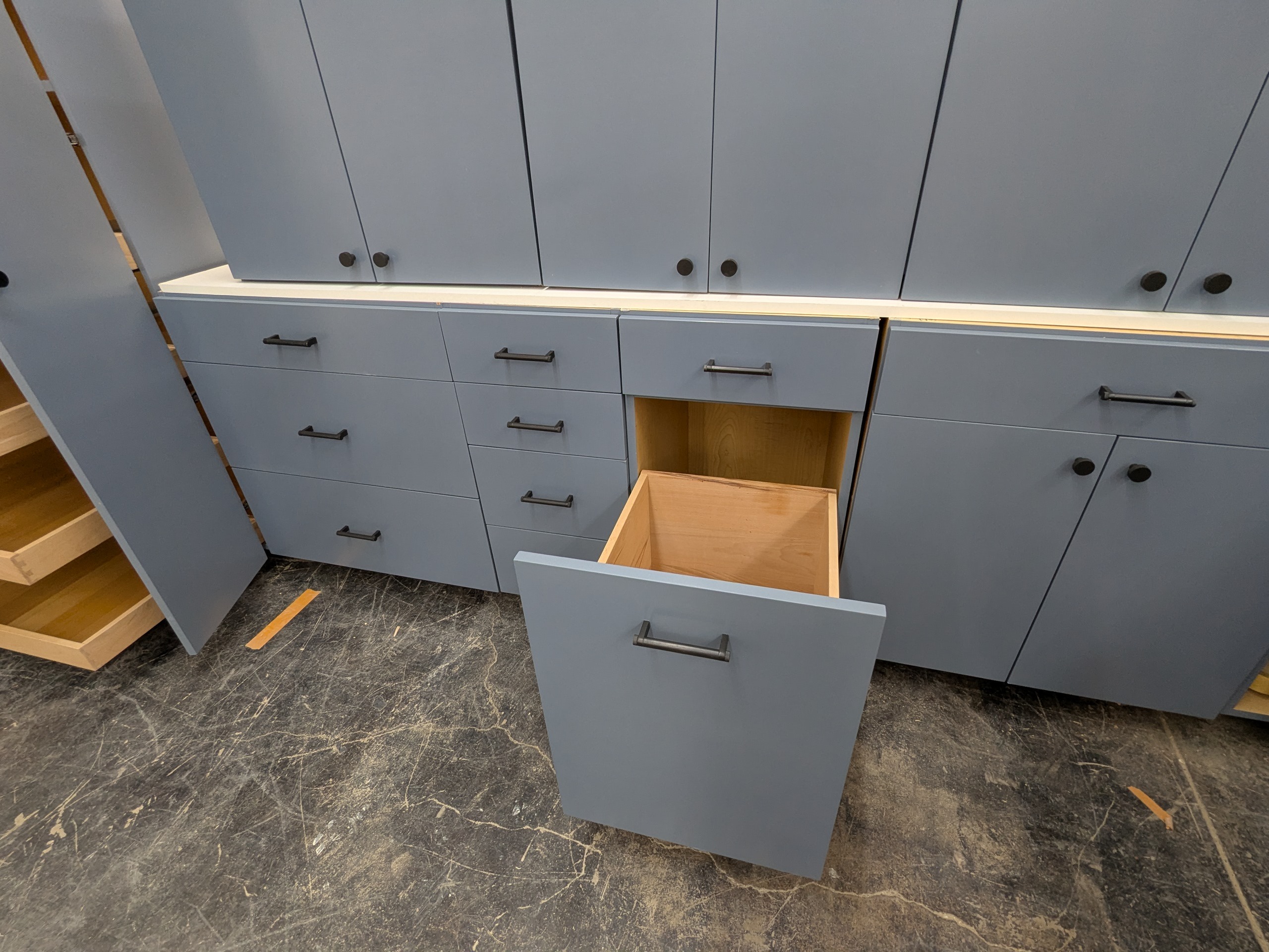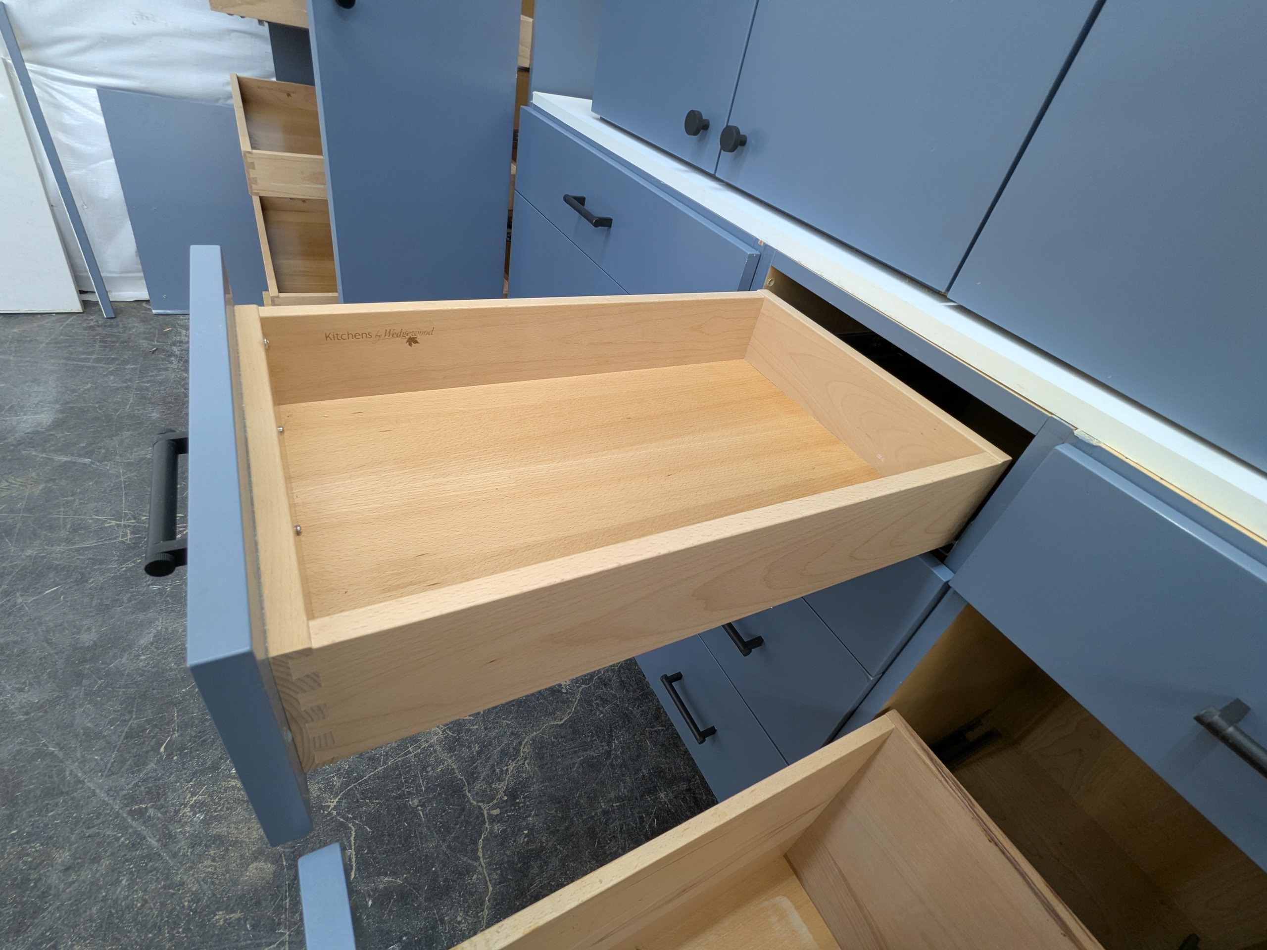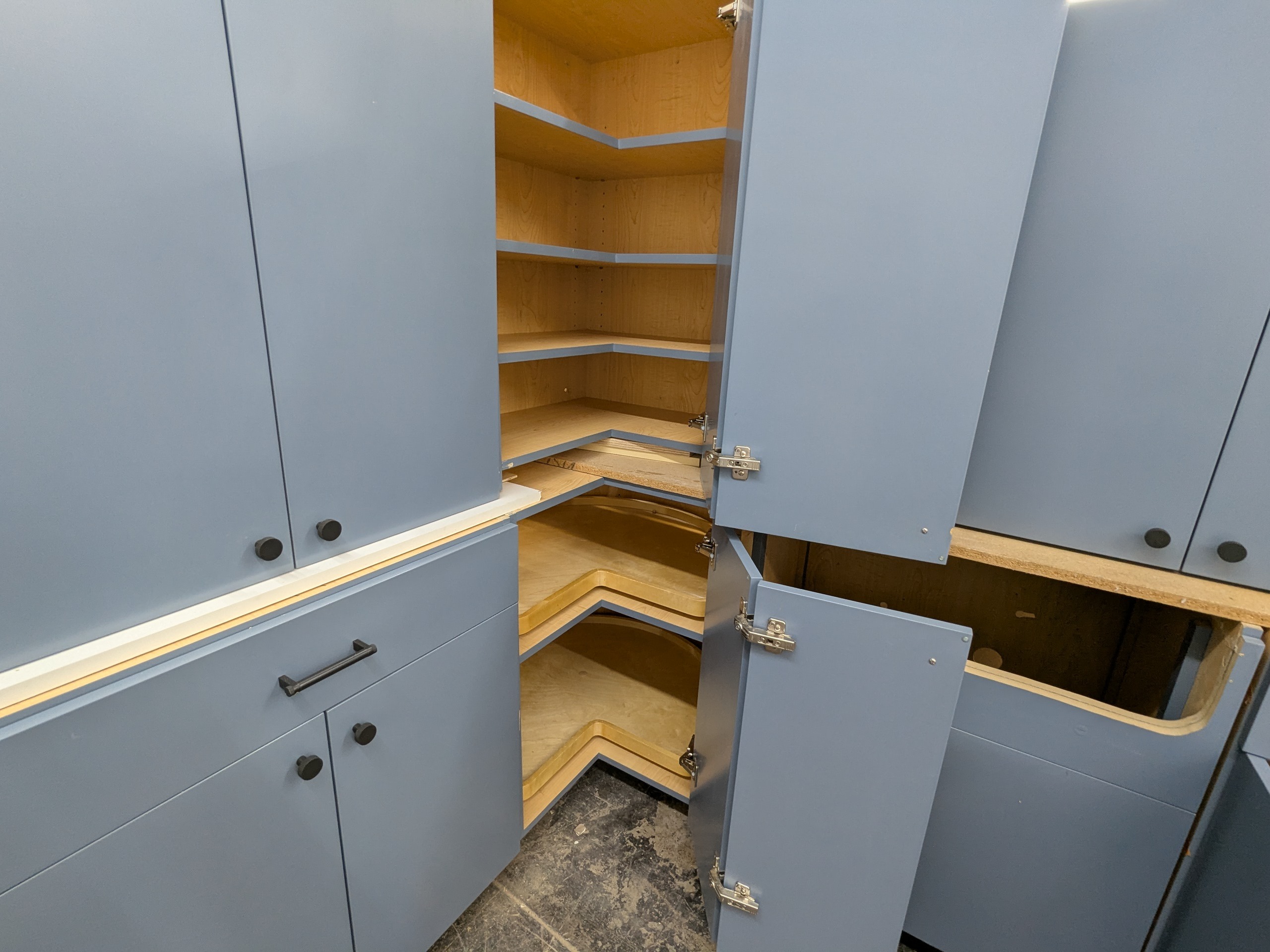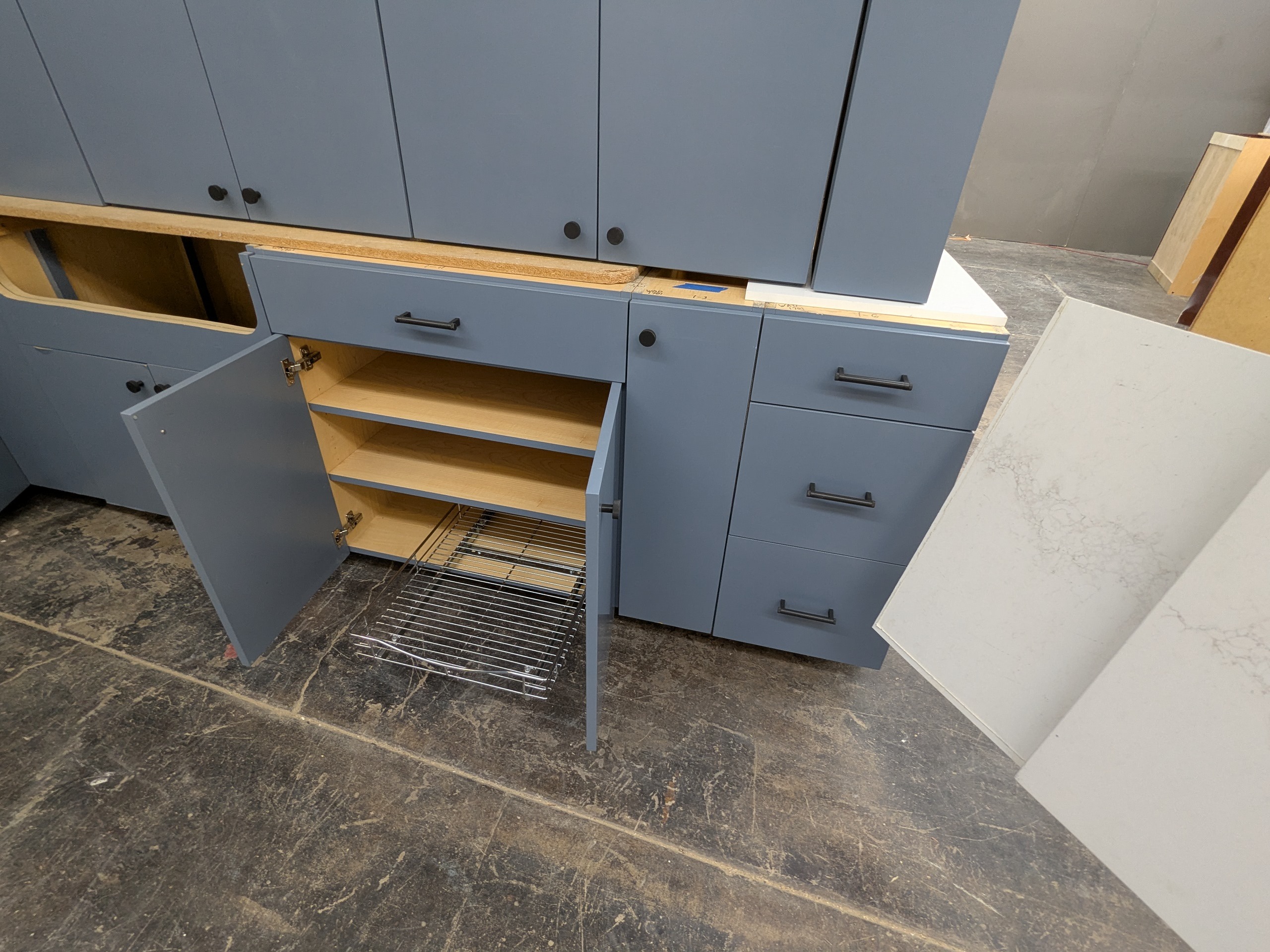 High quality set of blue frameless kitchen cabinets from Kitchens by Wedgewood with sanded dovetail drawer joints, soft close glides and hinges, and modern slab fronts. The package includes three drawer bases, an extremely beefy trash pullout, lazy susan, easy reach corner upper, a large pantry with dovetail and soft close rollout trays, and all the stunning slab quartz countertops. What a great set!