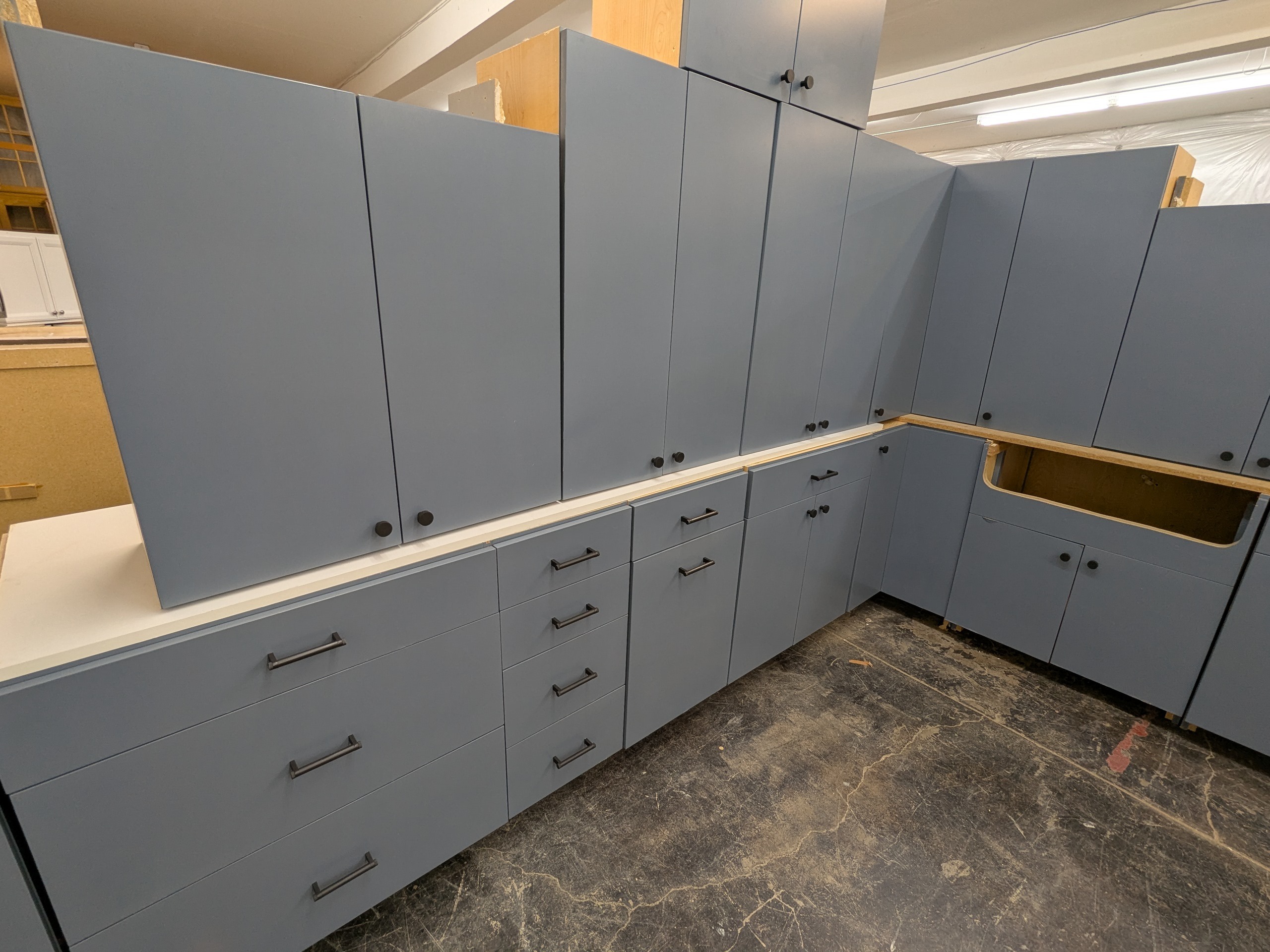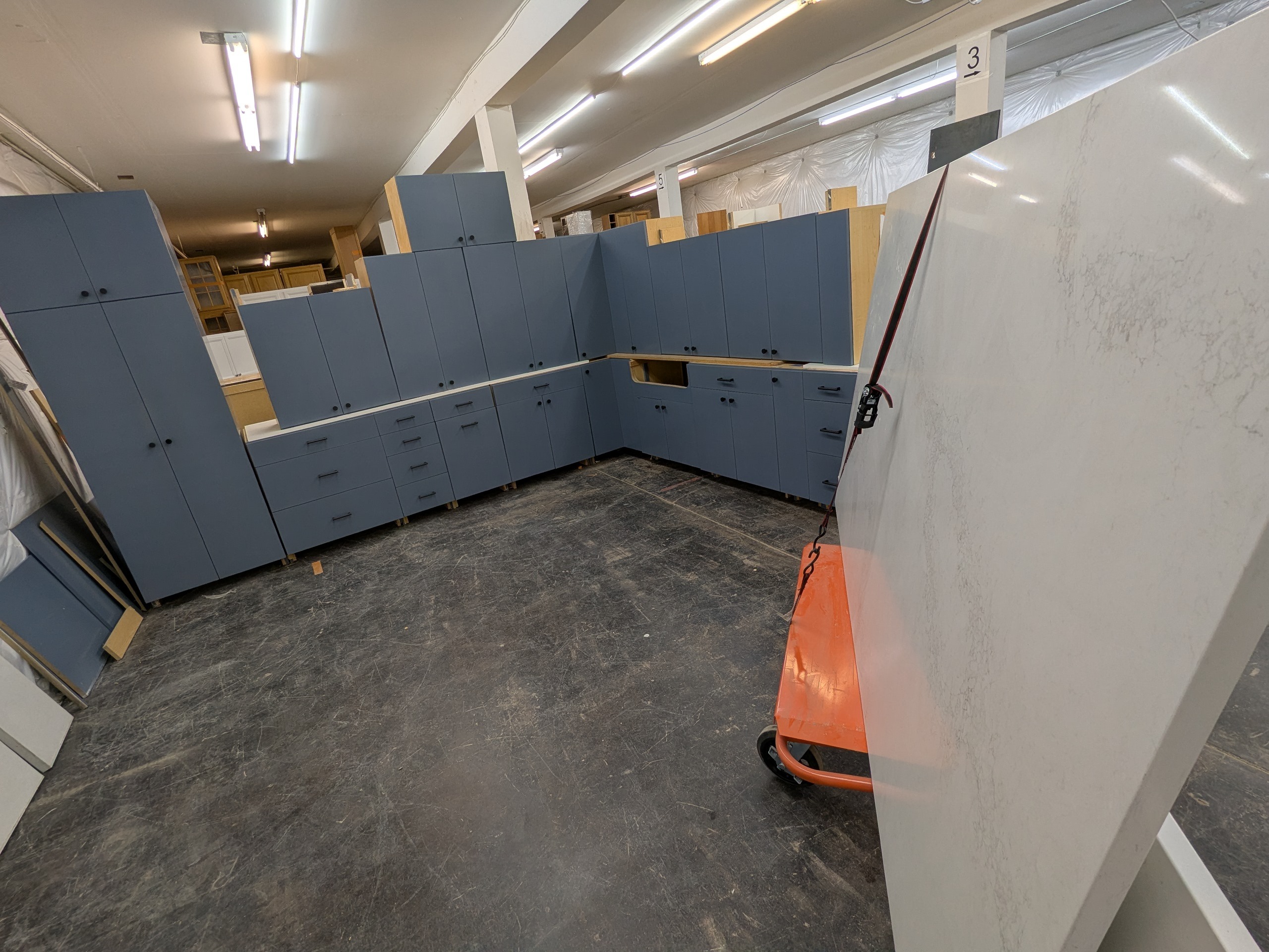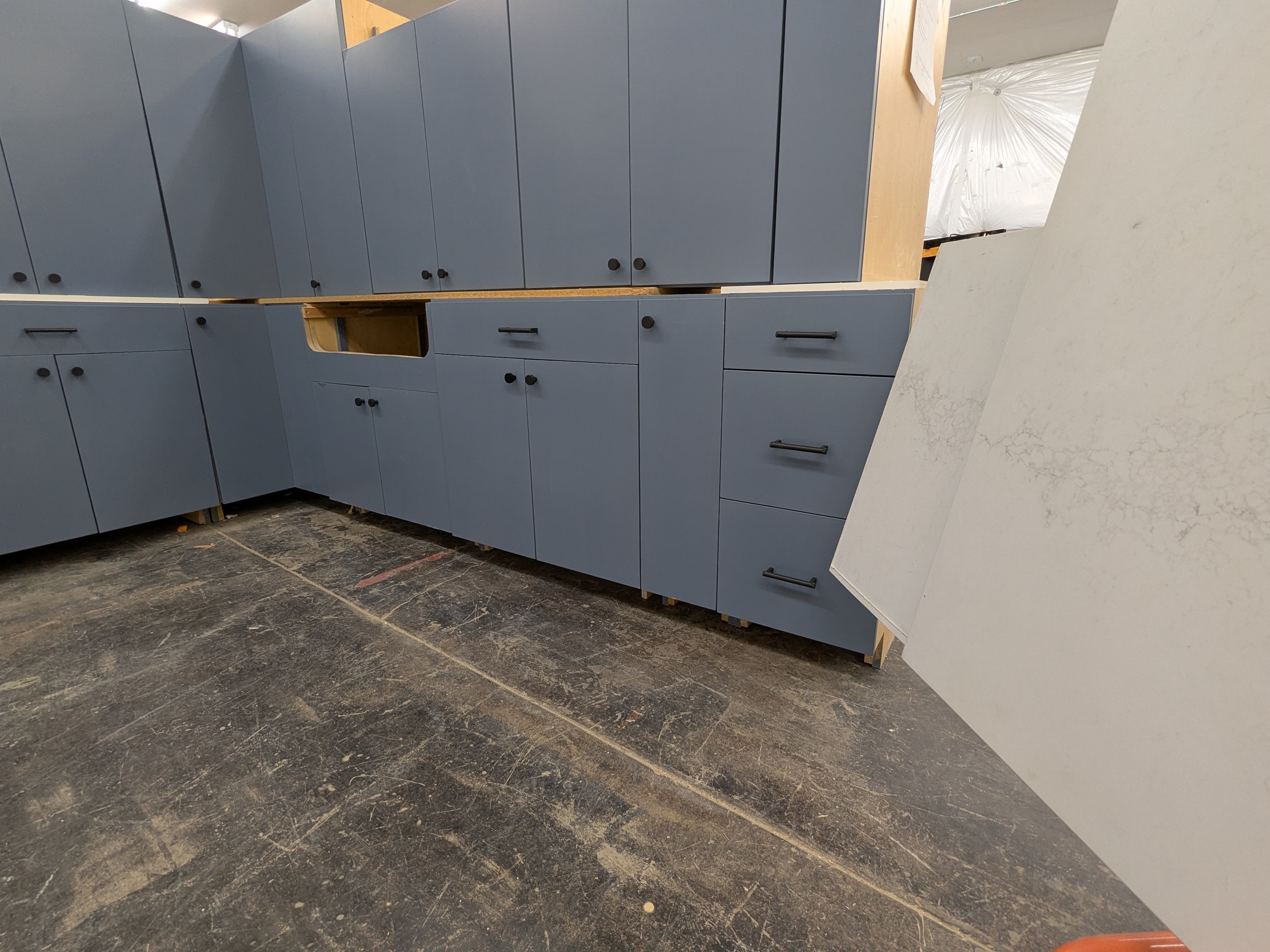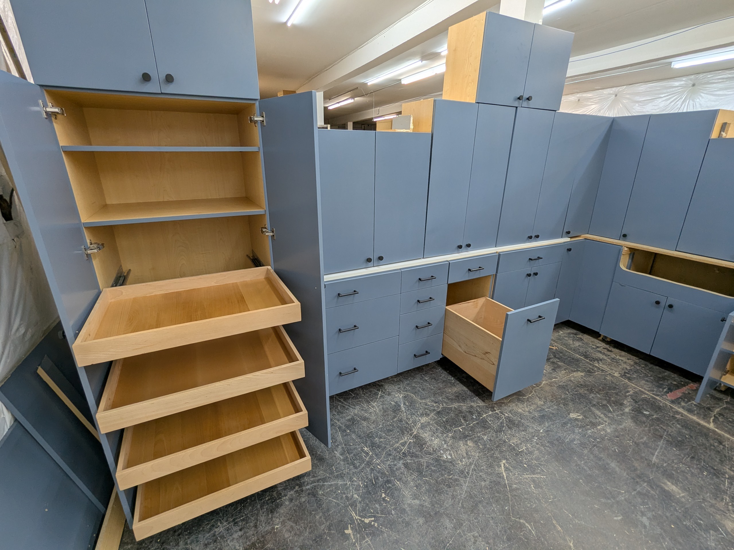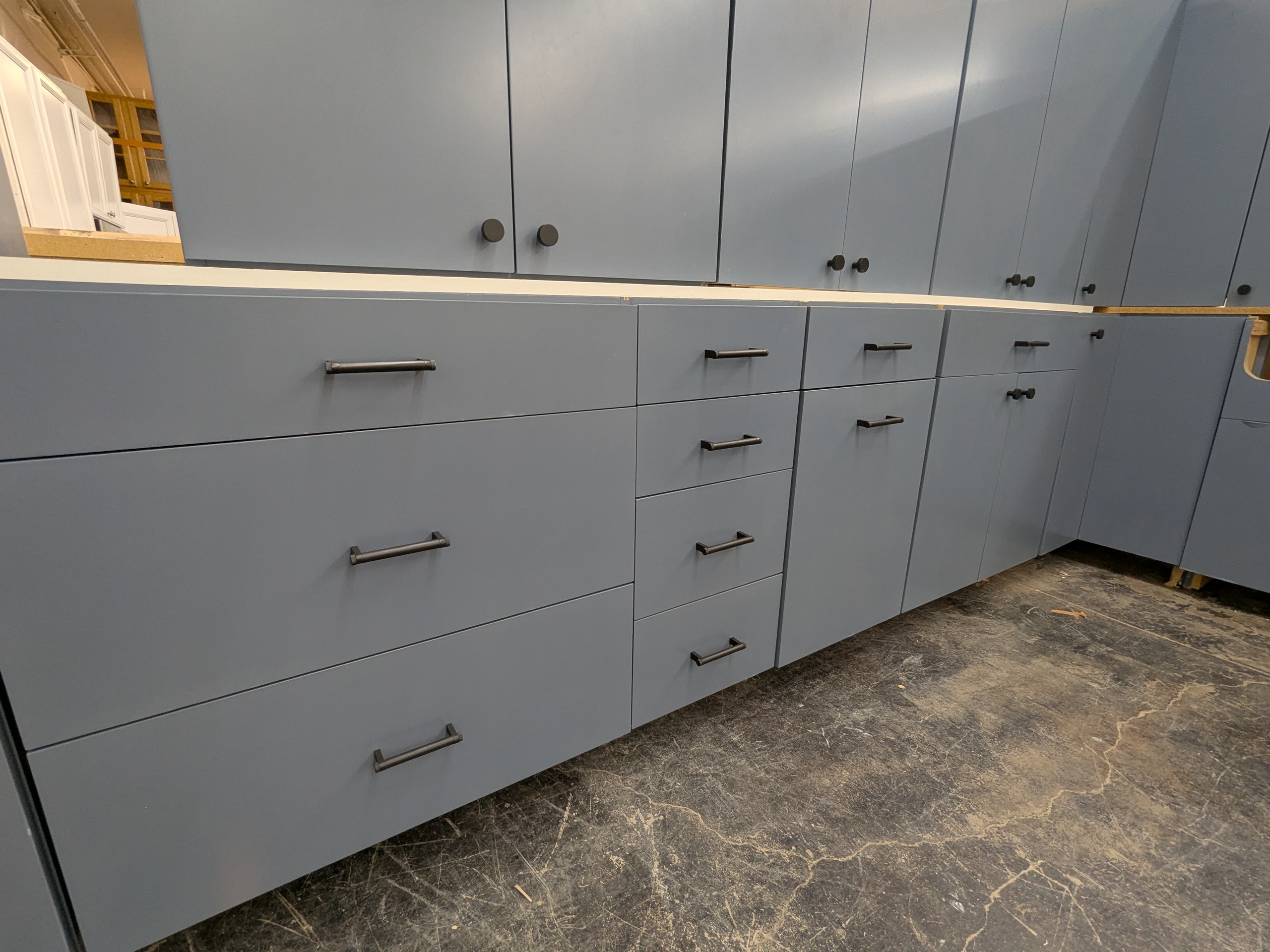 High quality set of blue frameless kitchen cabinets from Kitchens by Wedgewood with sanded dovetail drawer joints, soft close glides and hinges, and modern slab fronts. The package includes three drawer bases, an extremely beefy trash pullout, lazy susan, easy reach corner upper, a large pantry with dovetail and soft close rollout trays, and all the stunning slab quartz countertops. What a great set!