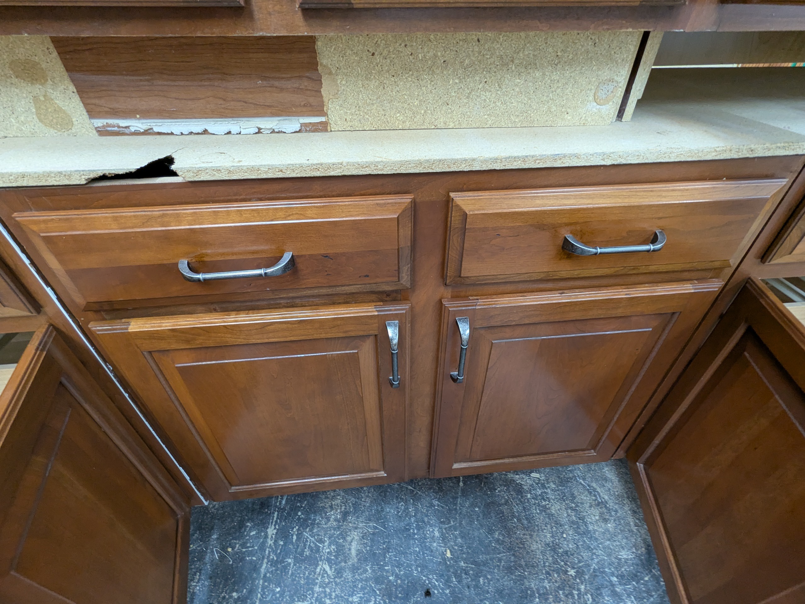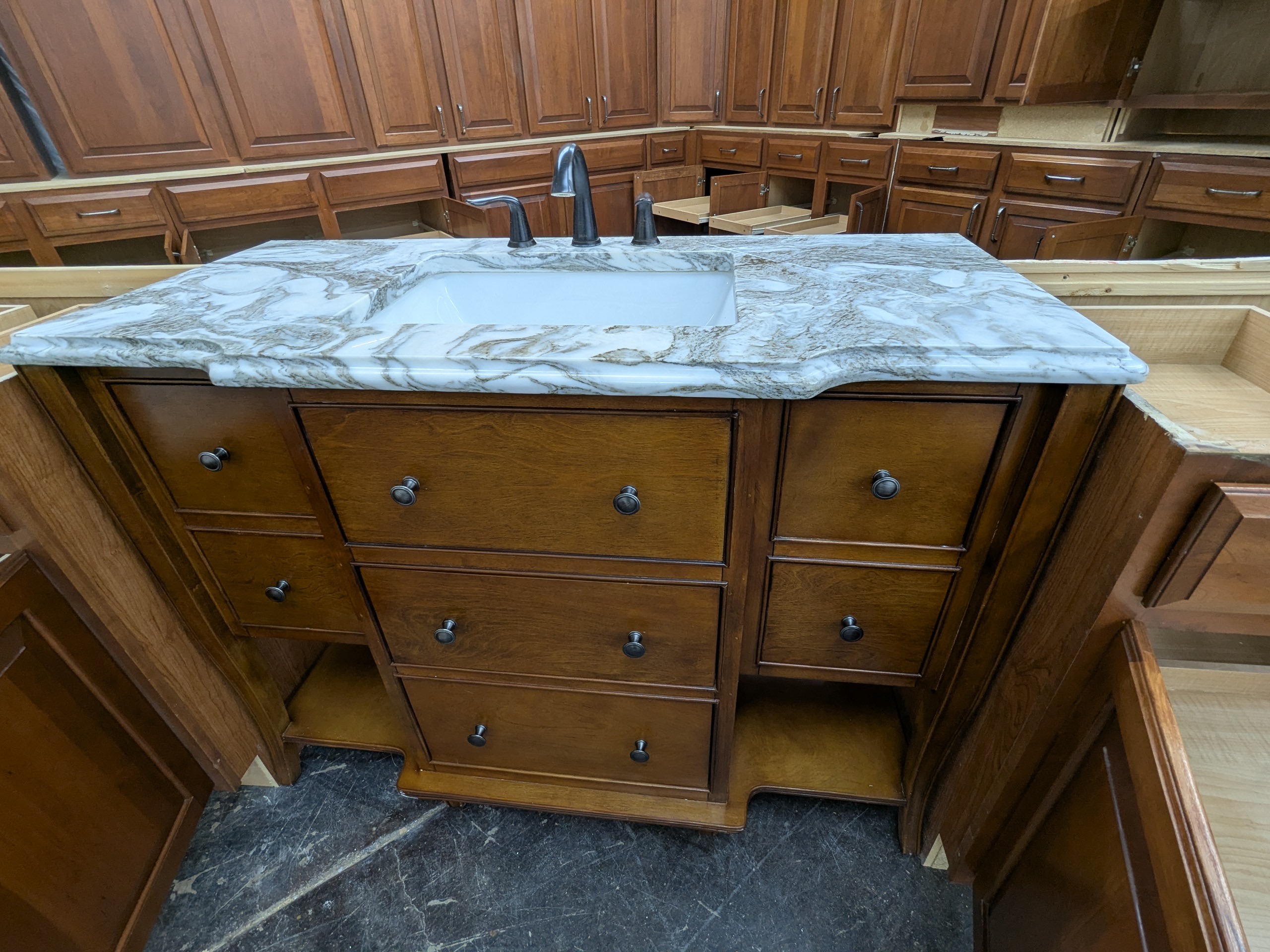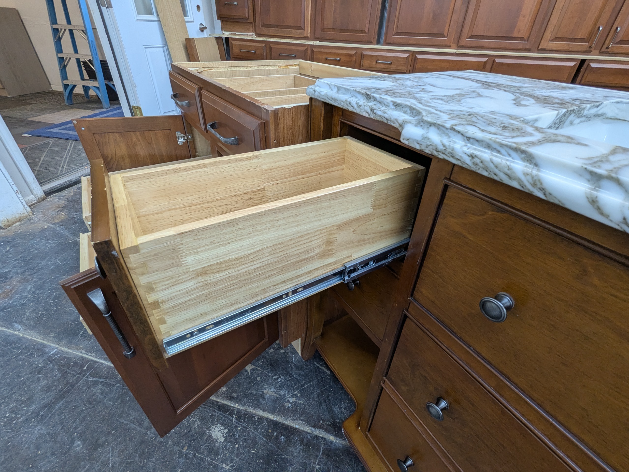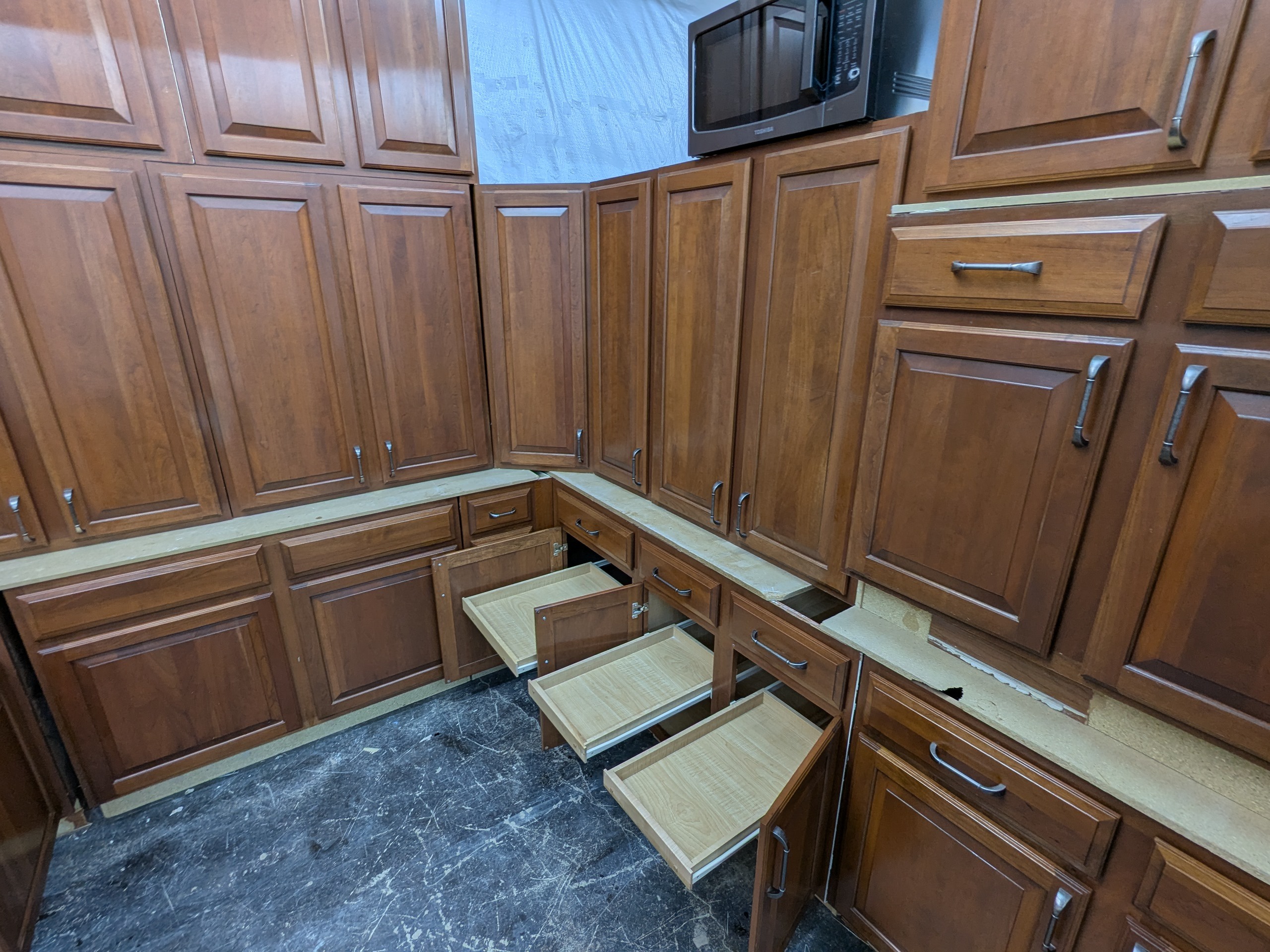 Large set of great looking Merillat used kitchen cabinets with TONS of rollout trays, stainless wall oven/microwave combo unit, and a gorgeous dovetail and soft close bathroom vanity package with granite top, sink, and faucet all ready to go.