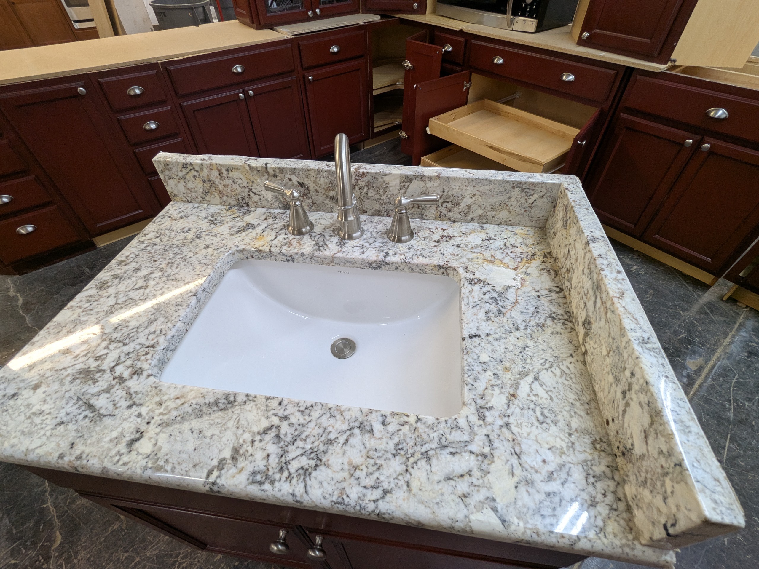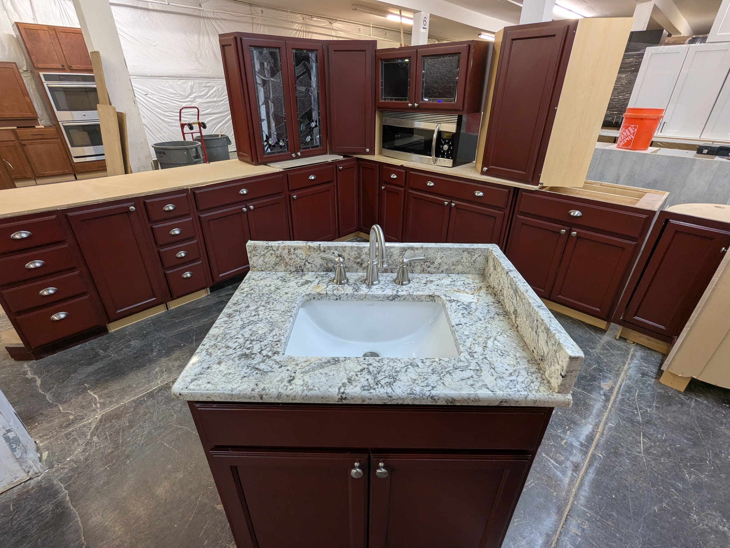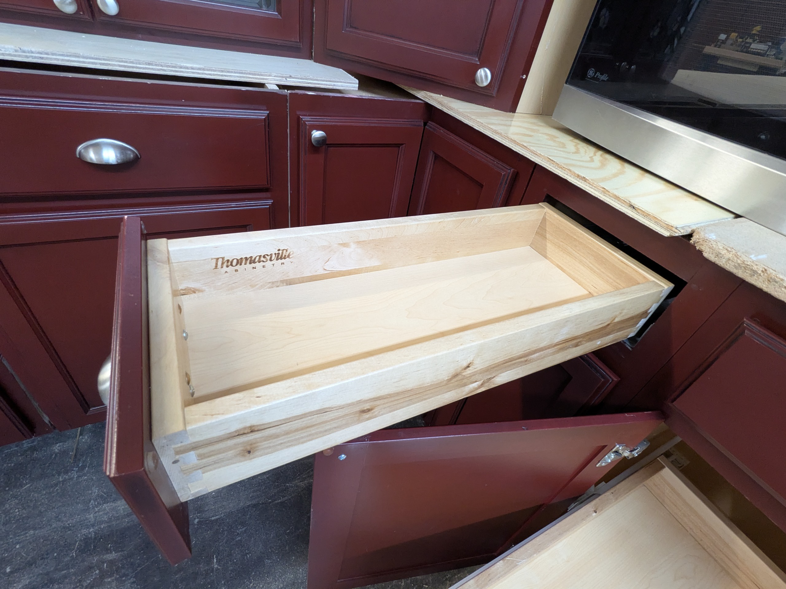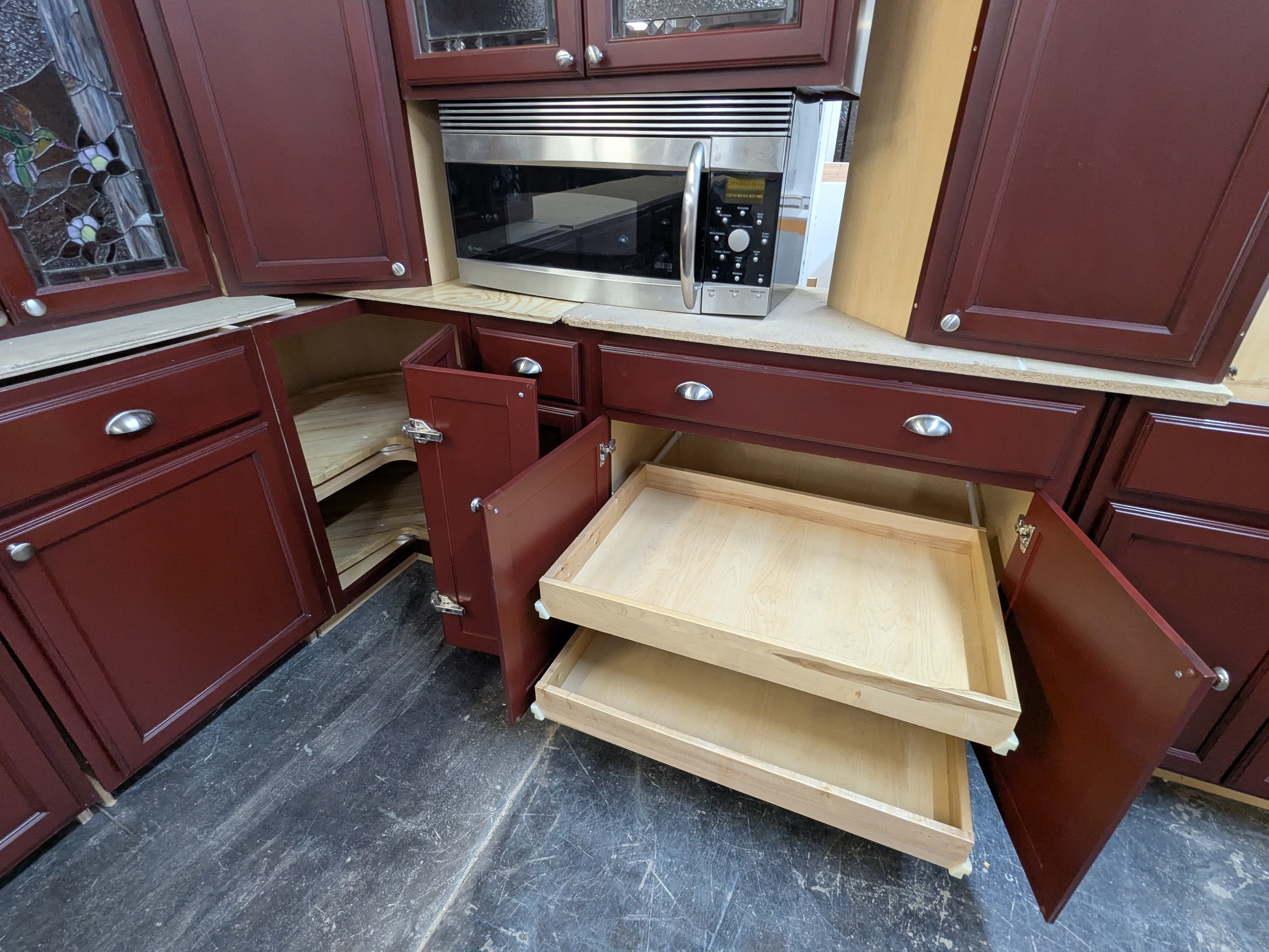 Thomasville used kitchen cabinets with dovetail drawers and soft close glides, leaded glass, vanity package w/ sink/faucet and granite top, two upper corner and two lower corner cabinets, super susan, rollout trays, and stainless microwave.
